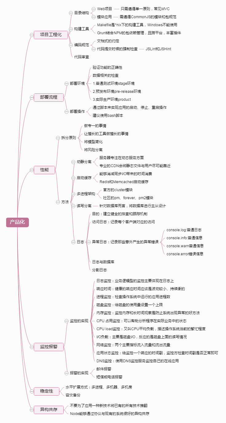 “行百里路半九十”,完成产品开发的代码编写后,才完成了项目的第一步。这是一章介绍了将 Node 产品化所需要的注意到的细节,如项目工程化、代码部署、日志、性能、监控报警、稳定性、异构共存。 对于 Node 开发者而言,很多其他语言走过的路需要开发者带着 Node 特效重新践行一遍。这并不是坏事,Node 更接近底层使得开发者对于细节的可控性非常高。