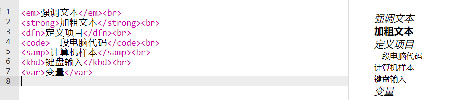 - <a>: 定义一个链接 - <b>: 定义粗体文本。 - <em>: 定义强调文本。 - <i>: 定义斜体文本。 - <dfn>: 定义定义项目。 - <kbd>: 定义键盘文本。 - <mark>: 定义带有记号的文本。 - <meter>: 定义度量衡。仅用于已知最大和最小值的度量。 - <pre>: 定义预格式文本 - <q>: 定义短的引用。 - <rt>: 定义字符(中文注音或字符)的解释或发音。 - <s>: 定义加删除线的文本。 - <samp>: 定义计算机代码样本。 - <small>: 定义小号文本。 - <strong>: 定义语气更为强烈的强调文本。 - <sub>: 定义下标文本。 - <sup>: 定义上标文本。 - <time>: 定义一个日期/时间 - <u>: 定义下划线文本。 - <code>: 定义计算机代码文本。 - <ruby>: 定义 ruby 注释(中文注音或字符)。 - <rp>: 定义不支持 ruby 元素的浏览器所显示的内容。 - <progress>: 定义运行中的任务进度(进程)。  - <abbr>: 定义一个缩写。  - <address>: 定义文档作者或拥有者的联系信息。  - <del>: 定义被删除文本。 <ins>: 定义被插入文本。  - <var>: 定义文本的变量部分。  - <wbr>: 规定在文本中的何处适合添加换行符。  - <bdi>: 允许您设置一段文本,使其脱离其父元素的文本方向设置。  - <bdo>: 定义文本的方向。  - <blockquote>: 定义块引用。  - <cite>: 定义引用(citation)。  - <tt>: 定义打字机文本。HTML5不再支持。 - <strike>: 定义加删除线的文本。HTML5不再支持。 HTML 4.01 已废弃。 - <font>: 定义文本的字体、尺寸和颜色。HTML5不再支持。 HTML 4.01 已废弃。 - <center>: 定义居中文本。HTML5不再支持。 HTML 4.01 已废弃。 - <big>: 定义大号文本。HTML5不再支持。 - <acronym>:定义只取首字母的缩写。HTML5不再支持。