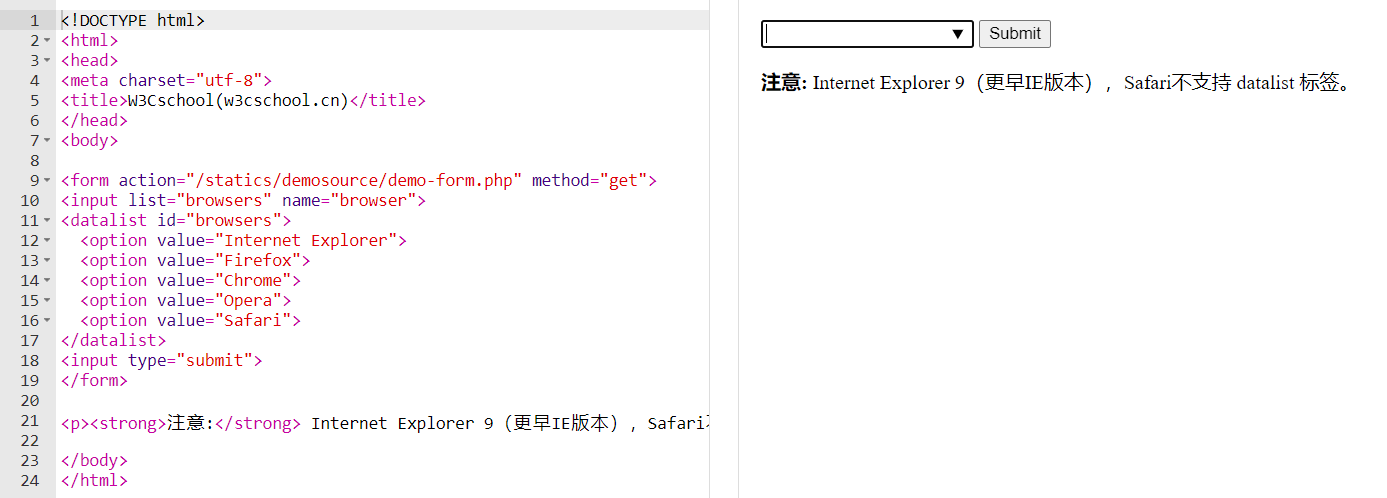 - **<form>:**定义供用户输入的表单 - **<input>:**定义输入域 - **<textarea>:**定义文本域 (一个多行的输入控件) - **<button>:**定义一个点击按钮 - **<select>:**定义了下拉选项列表 <optgroup>:定义选项组 <option>:定义下拉列表中的选项 - **<label>:**定义了 <input> 元素的标签,一般为输入标题  - **<fieldset>:**定义了一组相关的表单元素,并使用外框包含起来 <legend>:定义了 <fieldset> 元素的标题  - **<datalist>:**指定一个预先定义的输入控件选项列表  - **<output>:**定义一个计算结果  - **<keygen>:**定义了表单的密钥对生成器字段,已弃用