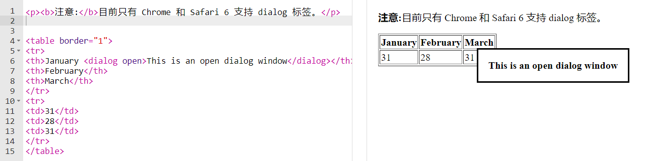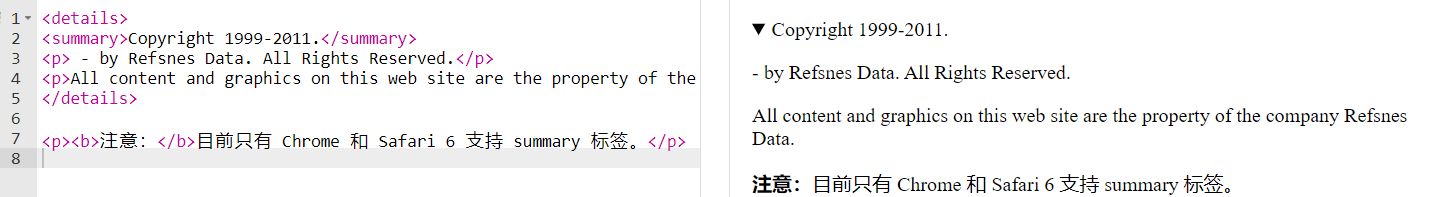 - **<div>:**定义文档中的节。 - **<span>:**定义文档中的节。 - **<header>:**定义一个文档头部部分 <header> 元素应该作为介绍内容或者导航链接栏的容器。 - **<footer>:**定义一个文档底部 在典型情况下,该元素会包含文档创作者的姓名、文档的版权信息、使用条款的链接、联系信息等等。 假如您使用 <footer> 元素来插入联系信息,应该在 <footer> 元素内使用 <address> 标签。 - **<section>:**定义了文档的某个区域,比如章节、头部、底部或者文档的其他区域。 - **<article>:**定义一个文章内容。 <article> 标签定义的内容本身必须是有意义的且必须是独立于文档的其余部分。 <article> 标签可以嵌套使用,内外层内容相关联。 <article> 标签主要是布局文章、内容方面的内容。 - **<aside>:**定义其所处内容之外的内容。 <aside> 的的内容可用作文章的侧栏。  - **<details>:**定义了用户可见的或者隐藏的需求的补充细节。 <summary>:定义一个可见的标题。 当用户点击标题时会显示出详细信息。  - **<dialog>:**定义一个对话框或者窗口  - **<nav>:**定义导航链接