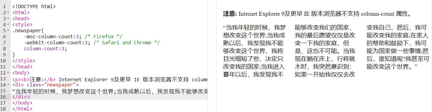 | 属性 | 说明 | CSS | |-----|-----|-----| | column-count | 指定元素应该分为的列数 | 3 | | column-fill | 指定如何填充列 | 3 | | column-gap | 指定列之间的差距 | 3 | | column-rule | 对于设置所有column-rule-*属性的简写属性 | 3 | | column-rule-color | 指定列之间的颜色规则 | 3 | | column-rule-style | 指定列之间的样式规则 | 3 | | column-rule-width | 指定列之间的宽度规则 | 3 | | column-span | 指定元素应该跨越多少列 | 3 | | column-width | 指定列的宽度 | 3 | | columns | 缩写属性设置列宽和列数 | 3 | ## columns - 语法:columns: column-width column-count; - 属性值 - column-width:列的宽度。 - column-count:列数。 ```css div{ columns:100px 3; -moz-columns:100px 3; /* Firefox */ -webkit-columns:100px 3; /* Safari 和 Chrome */ } ``` ## column-width属性 ```css div{ column-width:100px; -moz-column-width:100px; /* Firefox */ -webkit-column-width:100px; /* Safari 和 Chrome */ } ``` ## column-count属性 - JavaScript 语法::object.style.columnCount=3 - 属性值 - number:列的最佳数目将其中的元素的内容无法流出 - auto:列数将取决于其他属性,例如:"column-width"  ## column-fill属性 - 主流浏览器都不支持 column-fill 属性。 - 属性值 - balance:对列进行协调。浏览器应对列长度的差异进行最小化处理。 - auto:按顺序对列进行填充,列长度会各有不同。 ## column-gap属性 - Firefox 支持替代的 -moz-column-gap 属性。 - Safari 和 Chrome 支持替代的 -webkit-column-gap 属性。 - 属性值 - length:把列间的间隔设置为指定的长度。: - normal:规定列间间隔为一个常规的间隔。W3C 建议的值是 1em。 ```css div{ -moz-column-gap:40px; /* Firefox */ -webkit-column-gap:40px; /* Safari 和 Chrome */ column-gap:40px; } ``` ## column-rule属性 - column-rule属性是一个速记属性设置所有column-rule-*属性。column-rule属性设置列之间的宽度,样式和颜色。 - 语法:column-rule: column-rule-width column-rule-style column-rule-color; ```css div{ column-rule:3px outset #ff00ff; -moz-column-rule:3px outset #ff00ff; /* Firefox */ -webkit-column-rule:3px outset #ff00ff; /* Safari and Chrome */ } ``` ## column-rule-color属性 ```css div{ column-rule-color:#ff0000; -moz-column-rule-color:#ff0000; /* Firefox */ -webkit-column-rule-color:#ff0000; /* Safari and Chrome */ } ``` ## column-rule-style属性 - 属性值 - none:定义没有规则。 - hidden:定义隐藏规则。 - dotted:定义点状规则。 - dashed:定义虚线规则。 - solid:定义实线规则。 - double:定义双线规则。 - groove:定义 3D grooved 规则。该效果取决于宽度和颜色值。 - ridge:定义 3D ridged 规则。该效果取决于宽度和颜色值。 - inset:定义 3D inset 规则。该效果取决于宽度和颜色值。 - outset:定义 3D outset 规则。该效果取决于宽度和颜色值。 ```css div{ column-rule-style:dotted; -moz-column-rule-style:dotted; /* Firefox */ -webkit-column-rule-style:dotted; /* Safari and Chrome */ } ``` ## column-rule-width属性 - 属性值 - thin:指定一个细边框的规则 - medium:定义一个中等边框规则 - thick:指定一个粗边框的规则 - length:指定宽度的规则 ```css div{ column-rule-width:10px; -moz-column-rule-width:10px; /* Firefox */ -webkit-column-rule-width:10px; /* Safari and Chrome */ } ``` ## column-span属性 - 语法:column-span: 1|all; - 属性值 - 1:元素应横跨一列。 - all:元素应横跨所有列。 ```css h2{ -webkit-column-span:all; /* Chrome */ column-span:all; } ```