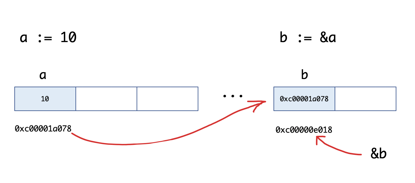 Go语言中的函数传参都是值拷贝,当我们想要修改某个变量的时候,我们可以创建一个指向该变量地址的指针变量。传递数据使用指针,而无须拷贝数据。类型指针不能进行偏移和运算。Go语言中的指针操作非常简单,只需要记住两个符号:&(取地址)和*(根据地址取值)。 区别于C/C++中的指针,Go语言中的指针不能进行偏移和运算,是安全指针。 ## 指针地址和指针类型 每个变量在运行时都拥有一个地址,这个地址代表变量在内存中的位置。Go语言中使用&字符放在变量前面对变量进行“取地址”操作。 Go语言中的值类型(int、float、bool、string、array、struct)都有对应的指针类型,如:*int、*int64、*string等。 - 取变量指针的语法如下: ```go ptr := &v // v的类型为T ``` - 其中: ```go v:代表被取地址的变量,类型为T ptr:用于接收地址的变量,ptr的类型就为*T,称做T的指针类型。*代表指针。 ``` - 举个例子: ```go func main() { a := 10 b := &a fmt.Printf("a:%d ptr:%p\n", a, &a) // a:10 ptr:0xc00001a078 fmt.Printf("b:%p type:%T\n", b, b) // b:0xc00001a078 type:*int fmt.Println(&b) // 0xc00000e018 } ``` 我们来看一下b := &a的图示:  ## 指针取值 在对普通变量使用&操作符取地址后会获得这个变量的指针,然后可以对指针使用*操作,也就是指针取值,代码如下。 ```go func main() { //指针取值 a := 10 b := &a // 取变量a的地址,将指针保存到b中 fmt.Printf("type of b:%T\n", b) c := *b // 指针取值(根据指针去内存取值) fmt.Printf("type of c:%T\n", c) fmt.Printf("value of c:%v\n", c) } ``` 总结: 取地址操作符&和取值操作符*是一对互补操作符,&取出地址,*根据地址取出地址指向的值。 变量、指针地址、指针变量、取地址、取值的相互关系和特性如下: 1. 对变量进行取地址(&)操作,可以获得这个变量的指针变量。 2. 指针变量的值是指针地址。 3. 对指针变量进行取值(*)操作,可以获得指针变量指向的原变量的值。 ## 空指针 - 当一个指针被定义后没有分配到任何变量时,它的值为 nil - 空指针的判断 ```go func main() { var p *string fmt.Println(p) fmt.Printf("p的值是%v\n", p) if p != nil { fmt.Println("非空") } else { fmt.Println("空值") } } ``` ## new和make 在Go语言中对于引用类型的变量,我们在使用的时候不仅要声明它,还要为它分配内存空间,否则我们的值就没办法存储。而对于值类型的声明不需要分配内存空间,是因为它们在声明的时候已经默认分配好了内存空间。要分配内存,就引出来今天的new和make。 Go语言中new和make是内建的两个函数,主要用来分配内存 ##### new new是一个内置的函数,它的函数签名如下: ```go func new(Type) *Type ``` 其中, ```go 1.Type表示类型,new函数只接受一个参数,这个参数是一个类型 2.*Type表示类型指针,new函数返回一个指向该类型内存地址的指针。 ``` new函数不太常用,使用new函数得到的是一个类型的指针,并且该指针对应的值为该类型的零值。。举个例子: ```go func main() { a := new(int) b := new(bool) fmt.Printf("%T\n", a) // *int fmt.Printf("%T\n", b) // *bool fmt.Println(*a) // 0 fmt.Println(*b) // false } ``` 本节开始的示例代码中var a *int只是声明了一个指针变量a但是没有初始化,指针作为引用类型需要初始化后才会拥有内存空间,才可以给它赋值。应该按照如下方式使用内置的new函数对a进行初始化之后就可以正常对其赋值了: ```go func main() { var a *int a = new(int) *a = 10 fmt.Println(*a) } ``` ##### make make也是用于内存分配的,区别于new,它只用于slice、map以及chan的内存创建,而且它返回的类型就是这三个类型本身,而不是他们的指针类型,因为这三种类型就是引用类型,所以就没有必要返回他们的指针了。make函数的函数签名如下: ```go func make(t Type, size ...IntegerType) Type ``` make函数是无可替代的,我们在使用slice、map以及channel的时候,都需要使用make进行初始化,然后才可以对它们进行操作。这个我们在上一章中都有说明,关于channel我们会在后续的章节详细说明。 本节开始的示例中var b map[string]int只是声明变量b是一个map类型的变量,需要像下面的示例代码一样使用make函数进行初始化操作之后,才能对其进行键值对赋值: ```go func main() { var b map[string]int b = make(map[string]int, 10) b["测试"] = 100 fmt.Println(b) } ``` ##### new与make的区别 1. 二者都是用来做内存分配的。 2. make只用于slice、map以及channel的初始化,返回的还是这三个引用类型本身; 3. 而new用于类型的内存分配,并且内存对应的值为类型零值,返回的是指向类型的指针。
