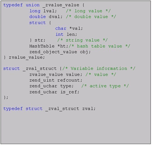 Zend引擎作为PHP的内核,有很多经典的设计机制,主要有以下几个: #### 1. 实现HashTable数据机构: HashTable是Zend的核心数据结构。在PHP里面几乎用来实现所有常见功能,我们知道的PHP数组即是其典型应用,此外,在zend内部,如函数符号表、全局变量等也都是基于hash table来实现。 Zend hash table实现了典型的hash表散列结构,同时通过附加一个双向链表,提供了正向、反向遍历数组的功能。其结构如下图  可以看到,在hash table中既有key->value形式的散列结构,也有双向链表模式,使得它能够非常方便的支持快速查找和线性遍历。 #### 2. PHP变量实现原理: PHP是一门弱类型语言,不严格区分变量的类型。PHP在变量申明的时候不需要指定类型。PHP在程序运行期间可能进行变量类型的隐示 转换。 和其他强类型语言一样,程序中也可以进行显示的类型转换。PHP变量可以分为简单类型(int、string、bool)、集合类型(array 、resource 、object)和常量(const)。以上所有的变量在底层都是同一种结构 zval。 Zval是zend中另一个非常重要的数据结构,用来标识并实现PHP变量,其数据结构如下:  Zval结构体主要由三部分组成: - type:指定了变量所述的类型(整数、字符串、数组等) - refcount&is_ref:用来实现引用计数(后面具体介绍) - value:核心部分,存储了变量的实际数据 - Zvalue是用来保存一个变量的实际数据。因为要存储多种类型,所以zvalue是一个union,也由此实现了弱类型。 #### 3. 整数、浮点数变量 整数、浮点数是PHP中的基础类型之一,也是一个简单型变量。对于整数和浮点数,在zvalue中直接存储对应的值。其类型分别是long和double。 从zvalue结构中可以看出,对于整数类型,和c等强类型语言不同,PHP是不区分int、unsigned int、long、long long等类型的,对它来说,整数只有一种类型也就是long。由此,可以看出,在PHP里面,整数的取值范围是由编译器位数来决定而不是固定不变的。 对于浮点数,类似整数,它也不区分float和double而是统一只有double一种类型。 在PHP中,如果整数范围越界了怎么办?这种情况下会自动转换为double类型,这个一定要小心,很多trick都是由此产生。 #### 4. 字符变量 和整数一样,字符变量也是PHP中的基础类型和简单型变量。通过zvalue结构可以看出,在PHP中,字符串是由由指向实际数据的指针和长度结 构体组成,这点和c++中的string比较类似。由于通过一个实际变量表示长度,和c不同,它的字符串可以是2进制数据(包含\0),同时在PHP中, 求字符串长度strlen是O(1)操作。 在新增、修改、追加字符串操作时,PHP都会重新分配内存生成新的字符串。最后,出于安全考虑,PHP在生成一个字符串时末尾仍然会添加\0 #### 5. 数组变量 PHP的数组通过Zend HashTable来天然实现。 foreach操作如何实现?对一个数组的foreach就是通过遍历hashtable中的双向链表完成。对于索引数组,通过foreach遍 历效率比for高很多,省去了key->value的查找。count操作直接调用 HashTable->NumOfElements,O(1)操作。对于’123’这样的字符串,zend会转换为其整数形 式。arr[‘123’]和arr[123]是等价的 #### 6. 资源变量 资源类型变量是PHP中最复杂的一种变量,也是一种复合型结构。 PHP的zval可以表示广泛的数据类型,但是对于自定义的数据类型却很难充分描述。由于没有有效的方式描绘这些复合结构,因此也没有办法对它们使用传统的操作符。要解决这个问题,只需要通过一个本质上任意的标识符(label)引用指针,这种方式被称为资源。 在zval中,对于resource,lval作为指针来使用,直接指向资源所在的地址。Resource可以是任意的复合结构,我们熟悉的mysqli、fsock、memcached等都是资源。 如何使用资源: - 1 注册:对于一个自定义的数据类型,要想将它作为资源。首先需要进行注册,zend会为它分配全局唯一标示。 - 2 获取一个资源变量:对于资源,zend维护了一个id->实际数据的hash_tale。对于一个resource,在zval中只记录了它的id。fetch的时候通过id在hash_table中找到具体的值返回。 - 3 资源销毁:资源的数据类型是多种多样的。Zend本身没有办法销毁它。因此需要用户在注册资源的时候提供销毁函数。当unset资源时,zend调用相应的函数完成析构。同时从全局资源表中删除它。 资源可以长期驻留,不只是在所有引用它的变量超出作用域之后,甚至是在一个请求结束并且新的请求产生之后。这些资源称为持久资源,因为它们贯通 SAPI的整个生命周期持续存在,除非特意销毁。很多情况下,持久化资源可以在一定程度上提高性能。比如我们常见的mysql_pconnect ,持久化资源通过pemalloc分配内存,这样在请求结束的时候不会释放。 对zend来说,对两者本身并不区分。 #### 7. PHP变量管理——引用计数和写时拷贝: 引用计数在内存回收、字符串操作等地方使用非常广泛。Zval的引用计数通过成员变量is_ref和ref_count实现,通过引用计数,多个变量可以共享同一份数据。避免频繁拷贝带来的大量消耗。在进行赋值操作时,zend将变量指向相同的zval同时ref_count++,在unset操作时,对应的ref_count-1。只有ref_count减为0时才会真正执行销毁操作。如果是引用赋值,则zend会修改is_ref为1。 PHP变量通过引用计数实现变量共享数据,那如果改变其中一个变量值呢?当试图写入一个变量时,Zend若发现该变量指向的zval被多个变量共享,则为其复制一份ref_count为1的zval,并递减原zval的refcount,这个过程称为“zval分离”。可见,只有在有写操作发生时 zend才进