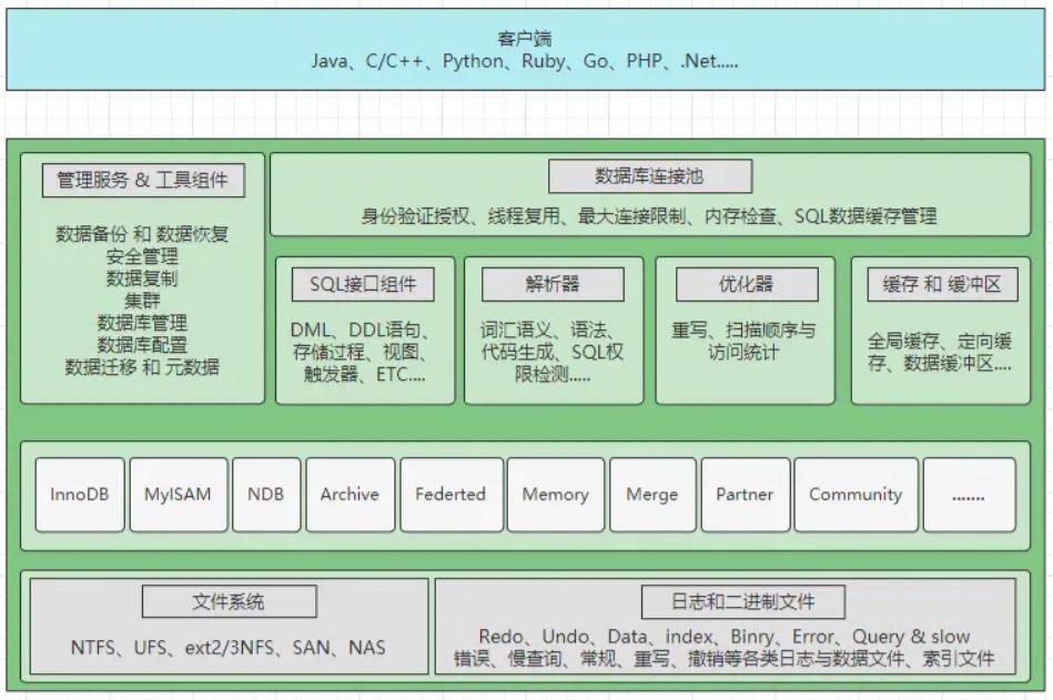 - **连接层:**最上层是一些客户端和连接服务。主要完成一些类似于连接处理、授权认证、及相关的安全方案。在该层上引入了线程池的概念,为通过认证安全接入的客户端提供线程。同样在该层上可以实现基于SSL的安全链接。服务器也会为安全接入的每个客户端验证它所具有的操作权限。 - **服务层:**第二层服务层,主要完成大部分的核心服务功能, 包括查询解析、分析、优化、缓存、以及所有的内置函数,所有跨存储引擎的功能也都在这一层实现,包括触发器、存储过程、视图等 - **引擎层:**第三层存储引擎层,存储引擎真正的负责了MySQL中数据的存储和提取,服务器通过API与存储引擎进行通信。不同的存储引擎具有的功能不同,这样我们可以根据自己的实际需要进行选取 - **存储层:**第四层为数据存储层,主要是将数据存储在运行于该设备的文件系统之上,并完成与存储引擎的交互 和其它数据库相比,MySQL有点与众不同,它的架构可以在多种不同场景中应用并发挥良好作用。主要体现在存储引擎的架构上,插件式的存储引擎架构将查询处理和其它的系统任务以及数据的存储提取相分离。这种架构可以根据业务的需求和实际需要选择合适的存储引擎。 - MySQL 的查询流程具体是?or 一条SQL语句在MySQL中如何执行的?  客户端请求 ---> 连接器(验证用户身份,给予权限) ---> 查询缓存(存在缓存则直接返回,不存在则执行后续操作) ---> 分析器(对SQL进行词法分析和语法分析操作) ---> 优化器(主要对执行的sql优化选择最优的执行方案方法) ---> 执行器(执行时会先看用户是否有执行权限,有才去使用这个引擎提供的接口) ---> 去引擎层获取数据返回(如果开启查询缓存则会缓存查询结果)
