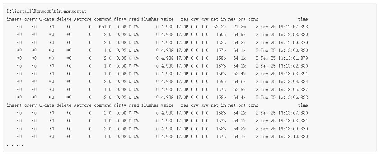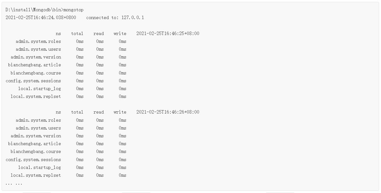 ## mongostat 命令 >mongostat是mongodb自带的状态检测工具,在命令行下使用。它会间隔固定时间获取mongodb的当前运行状态,并输出。如果你发现数据库突然变慢或者有其他问题的话,你第一手的操作就考虑采用mongostat来查看mongo的状态。  ## mongotop 命令 >mongotop也是mongodb下的一个内置工具,mongotop提供了一个方法,用来跟踪一个MongoDB的实例,查看哪些大量的时间花费在读取和写入数据。 mongotop提供每个集合的水平的统计数据。默认情况下,mongotop返回值的每一秒。