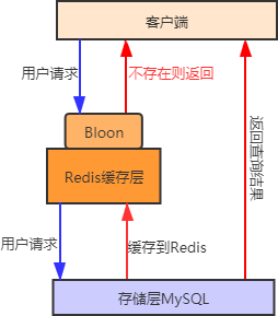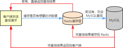 在实际的业务场景中,Redis 一般和其他数据库搭配使用,用来减轻后端数据库的压力,比如和关系型数据库 MySQL 配合使用。 Redis 会把 MySQL 中经常被查询的数据缓存起来,比如热点数据,这样当用户来访问的时候,就不需要到 MySQL 中去查询了,而是直接获取 Redis 中的缓存数据,从而降低了后端数据库的读取压力。如果说用户查询的数据 Redis 没有,此时用户的查询请求就会转到 MySQL 数据库,当 MySQL 将数据返回给客户端时,同时会将数据缓存到 Redis 中,这样用户再次读取时,就可以直接从 Redis 中获取数据。流程图如下所示:  ## 缓存穿透 缓存穿透是指当用户查询某个数据时,Redis 中不存在该数据,也就是缓存没有命中,此时查询请求就会转向持久层数据库 MySQL,结果发现 MySQL 中也不存在该数据,MySQL 只能返回一个空对象,代表此次查询失败。如果这种类请求非常多,或者用户利用这种请求进行恶意攻击,就会给 MySQL 数据库造成很大压力,甚至于崩溃,这种现象就叫缓存穿透。 为了避免缓存穿透问题,下面介绍两种解决方案: 1. 缓存空对象 当 MySQL 返回空对象时, Redis 将该对象缓存起来,同时为其设置一个过期时间。当用户再次发起相同请求时,就会从缓存中拿到一个空对象,用户的请求被阻断在了缓存层,从而保护了后端数据库,但是这种做法也存在一些问题,虽然请求进不了 MSQL,但是这种策略会占用 Redis 的缓存空间。 1. 布隆过滤器 我们知道,布隆过滤器判定不存在的数据,那么该数据一定不存在,利用它的这一特点可以防止缓存穿透。 首先将用户可能会访问的热点数据存储在布隆过滤器中(也称缓存预热),当有一个用户请求到来时会先经过布隆过滤器,如果请求的数据,布隆过滤器中不存在,那么该请求将直接被拒绝,否则将继续执行查询。相较于第一种方法,用布隆过滤器方法更为高效、实用。其流程示意图如下:  ## 缓存击穿 缓存击穿是指用户查询的数据缓存中不存在,但是后端数据库却存在,这种现象出现原因是一般是由缓存中 key 过期导致的。比如一个热点数据 key,它无时无刻都在接受大量的并发访问,如果某一时刻这个 key 突然失效了,就致使大量的并发请求进入后端数据库,导致其压力瞬间增大。这种现象被称为缓存击穿。 缓存击穿有两种解决方法: 1. 改变过期时间,设置热点数据永不过期。 1. 分布式锁。采用分布式锁的方法,重新设计缓存的使用方式,过程如下: **上锁:**当我们通过 key 去查询数据时,首先查询缓存,如果没有,就通过分布式锁进行加锁,第一个获取锁的进程进入后端数据库查询,并将查询结果缓到Redis 中。 **解锁:**当其他进程发现锁被某个进程占用时,就进入等待状态,直至解锁后,其余进程再依次访问被缓存的 key。 ## 缓存雪崩 缓存雪崩是指缓存中大批量的 key 同时过期,而此时数据访问量又非常大,从而导致后端数据库压力突然暴增,甚至会挂掉,这种现象被称为缓存雪崩。它和缓存击穿不同,缓存击穿是在并发量特别大时,某一个热点 key 突然过期,而缓存雪崩则是大量的 key 同时过期,因此它们根本不是一个量级。 解决方案 缓存雪崩和缓存击穿有相似之处,所以也可以采用热点数据永不过期的方法,来减少大批量的 key 同时过期。再者就是为 key 设置随机过期时间,避免 key 集中过期。