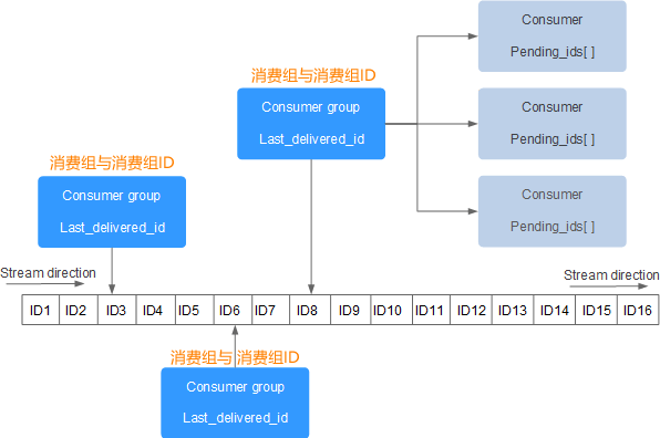 Redis Stream 是 Redis 5.0 版本新增加的数据结构。 Redis Stream 主要用于消息队列(MQ,Message Queue),Redis 本身是有一个 Redis 发布订阅 (pub/sub) 来实现消息队列的功能,但它有个缺点就是消息无法持久化,如果出现网络断开、Redis 宕机等,消息就会被丢弃。 简单来说发布订阅 (pub/sub) 可以分发消息,但无法记录历史消息。 而 Redis Stream 提供了消息的持久化和主备复制功能,可以让任何客户端访问任何时刻的数据,并且能记住每一个客户端的访问位置,还能保证消息不丢失。  下面对上图涉及的专有名词做简单解释: - Stream direction:表示数据流,它是一个消息链,将所有的消息都串起来,每个消息都有一个唯一标识 ID 和对应的消息内容(Message content)。 - Consumer Group :表示消费组,拥有唯一的组名,使用 XGROUP CREATE 命令创建。一个 Stream 消息链上可以有多个消费组,一个消费组内拥有多个消费者,每一个消费者也有一个唯一的 ID 标识。 - last_delivered_id :表示消费组游标,每个消费组都会有一个游标 last_delivered_id,任意一个消费者读取了消息都会使游标 last_delivered_id 往前移动。 - pending_ids :Redis 官方称为 PEL,表示消费者的状态变量,它记录了当前已经被客户端读取的消息 ID,但是这些消息没有被 ACK(确认字符)。如果客户端没有 ACK,那么这个变量中的消息 ID 会越来越多,一旦被某个消息被 ACK,它就开始减少。 ### 消息队列相关命令: - xadd - 添加消息到末尾 - xtrim - 对流进行修剪,限制长度 - xdel - 删除消息 - xlen - 获取流包含的元素数量,即消息长度 - xrange - 获取消息列表,会自动过滤已经删除的消息 - xrevrange - 反向获取消息列表,id 从大到小 - xread - 以阻塞或非阻塞方式获取消息列表 ### 消费者组相关命令: - xgroup create - 创建消费者组 - xreadgroup group - 读取消费者组中的消息 - xack - 将消息标记为"已处理" - xgroup setid - 为消费者组设置新的最后递送消息id - xgroup delconsumer - 删除消费者 - xgroup destroy - 删除消费者组 - xpending - 显示待处理消息的相关信息 - xclaim - 转移消息的归属权 - xinfo - 查看流和消费者组的相关信息; - xinfo groups - 打印消费者组的信息; - xinfo stream - 打印流信息
