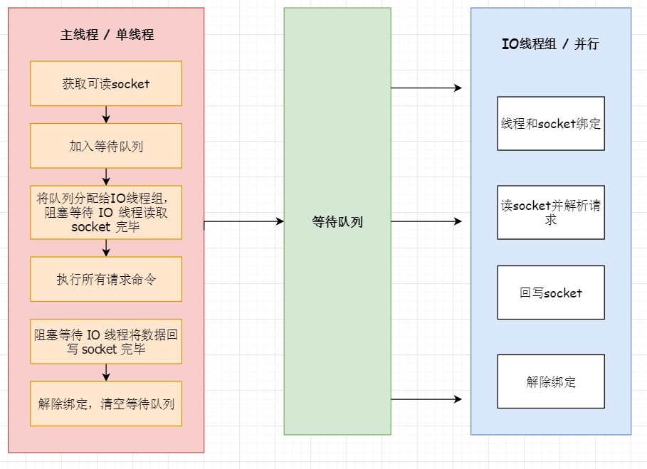 #### Redis 6 之前真的是单线程吗? Redis 在处理客户端的请求时,包括获取 (socket 读)、解析、执行、内容返回 (socket 写) 等都由一个顺序串行的主线程处理,这就是所谓的单线程。但如果严格来讲从 Redis 4 之后并不是单线程,除了主线程外,它也有后台线程在处理一些较为缓慢的操作,例如清理脏数据、无用连接的释放、大 key 的删除等等。 #### Redis 6 之前为什么使用单线程? 使用了单线程后,可维护性高。多线程模型虽然在某些方面表现优异,但是它却引入了程序执行顺序的不确定性,带来了并发读写的一系列问题,增加了系统复杂度、同时可能存在线程切换、甚至加锁解锁、死锁造成的性能损耗。 同时 Redis 通过 AE 事件模型以及 IO 多路复用等技术,即使单线程处理性能也非常高,因此没有必要使用多线程。单线程机制使得 Redis 内部实现的复杂度大大降低,Hash 的惰性 Rehash、Lpush 等等 “线程不安全” 的命令都可以无锁进行。 #### Redis 6 为何引入多线程? 随着目前行业内越来越复杂的业务场景,有些公司动不动就上亿的交易量,因此需要更大的 QPS。常见的解决方案是在分布式架构中对数据进行分区并采用多个服务器,但该方案有非常大的缺点,比如: 1)要管理的 Redis 服务器太多,维护代价大; 2)某些适用于单个 Redis 服务器的命令不适用于数据分区; 3)数据分区无法解决热点读/写问题; 4)数据偏斜,重新分配和放大/缩小变得更加复杂等等。 从 Redis 自身角度来说,因为读写网络的 read/write 系统调用占用了 Redis 执行期间大部分 CPU 时间,瓶颈主要在于网络的 IO 消耗, 优化主要有两个方向: 1)提高网络 IO 性能,典型的实现比如使用 DPDK 来替代内核网络栈的方式; 2)使用多线程充分利用多核,典型的实现比如 Memcached。 协议栈优化的这种方式跟 Redis 关系不大,支持多线程是一种最有效最便捷的操作方式。所以总结起来,Redis 支持多线程主要就是两个原因: 可以充分利用服务器 CPU 资源,目前主线程只能利用一个核; 多线程任务可以分摊 Redis 同步 IO 读写负荷。 #### 多线程如何开启以及配置? Redis 6 的多线程默认是禁用的,只使用主线程。如需开启需要修改 redis.conf 配置文件中的 io-threads-do-reads yes。 开启多线程后,还需要设置线程数,否则是不生效的。同样修改 redis.conf 文件中的 io-threads [n] 配置。 关于线程数的设置,官方有一个建议:4 核的机器建议设置为 2 或 3 个线程,8 核的建议设置为 6 个线程,线程数一定要小于机器核数。还需要注意的是,线程数并不是越大越好,官方认为超过了 8 个基本就没什么意义了。 #### Redis 多线程的实现机制?  大致流程如下: 1)主线程负责接收建立连接请求,获取 socket 放入全局等待读处理队列; 2)主线程处理完读事件之后,通过 RR(Round Robin) 将这些连接分配给这些 IO 线程; 3)主线程阻塞等待 IO 线程读取 socket 完毕; 4)主线程通过单线程的方式执行请求命令,请求数据读取并解析完成,但并不执行; 5)主线程阻塞等待 IO 线程将数据回写 socket 完毕; 6)解除绑定,清空等待队列。 该设计的特点: 1)IO 线程要么同时在读 socket,要么同时在写,不会同时读或写。 2)IO 线程只负责读写 socket 解析命令,不负责命令处理。 #### 多线程是否会导致线程安全问题? 从上面的实现机制可以看出,Redis 的多线程部分只是用来处理网络数据的读写和协议解析,执行命令仍然是单线程顺序执行。所以我们不需要去考虑控制 key、lua、事务,LPUSH/LPOP 等等的并发及线程安全问题。 #### Redis 和 Memcached 多线程区别? 相同点:都采用了 master 线程 - worker 线程的模型。 不同点:Memcached 执行主逻辑也是在 worker 线程里,模型更加简单,实现了真正的线程隔离,符合我们对线程隔离的常规理解。而 Redis 把处理逻辑交还给 master 线程,虽然一定程度上增加了模型复杂度,但也解决了线程并发安全等问题。
