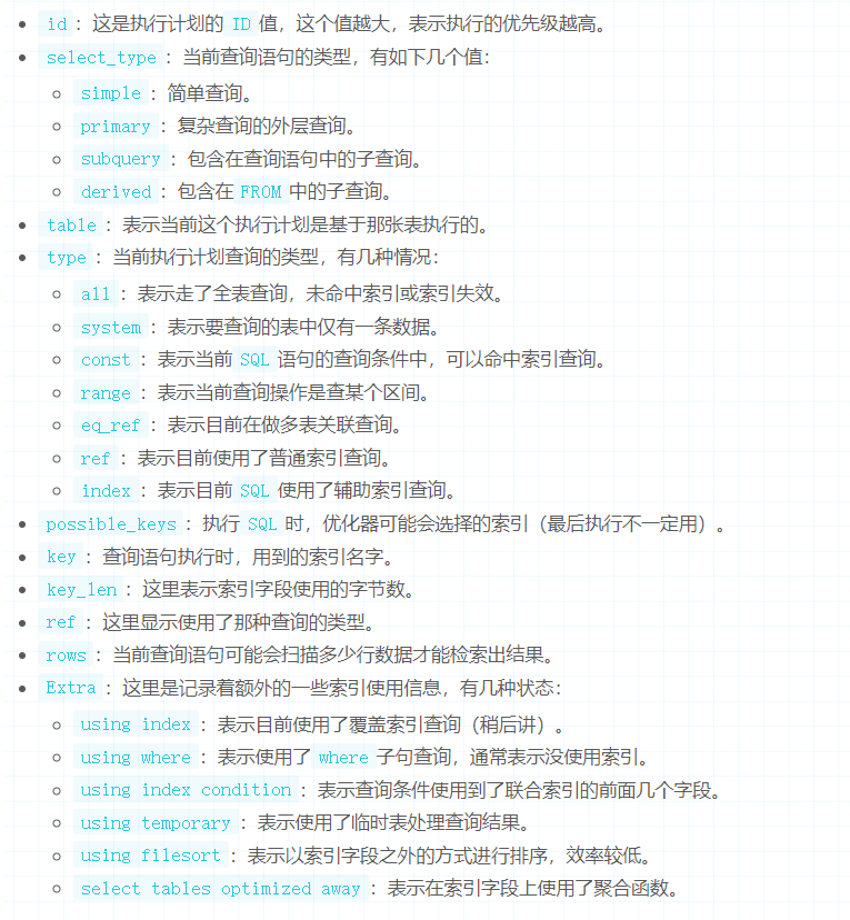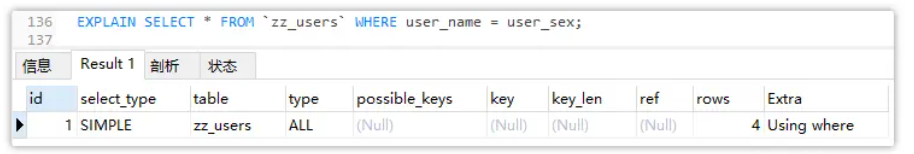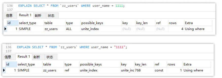但很多小伙伴在平时写SQL的时候,一般只追求实现业务功能,只要能够查询出相应的数据即可,压根不会过度考虑这条SQL应用到索引,那么这里就是给出一些经验之谈,讲清楚几点写SQL时的方法论。 其实索引本身是一把双刃剑,用的好能够给我们带来异乎寻常的查询效率,用的不好则反而会带来额外的磁盘占用及写入操作时的维护开销。因此大家一定要切记,既然选择建了索引,那一定要利用它,否则还不如干脆别建,既能节省磁盘空间,又能提升写入效率。 ### 执行分析工具 - ExPlain 但想要查看一条SQL是否使用了索引,需要用到一个自带的分析工具ExPlain。先来看看这个工具/命令的作用,当在一条SQL前加上explain命令,执行这条SQL后会列出所有的执行方案:   对于上述这么多的字段,其实目前不需要完全弄懂,本文只需要记住里面的type字段即可,all表示走全表扫描,const、ref...表示通过索引查询。 ### 查询中带有OR会导致索引失效 即使一条SQL包含了主键索引的字段,或包含了联合索引的第一个字段,若使用了OR,最终导致索引失效。 ### 模糊查询中like以%开头导致索引失效 ```sql --索引失效 EXPLAIN SELECT * FROM `zz_users` WHERE user_name LIKE "%熊"; --使用了索引 EXPLAIN SELECT * FROM `zz_users` WHERE user_name LIKE "熊%"; ``` >以%结尾,其实可以使用联合索引来检索数据,并不会导致索引失效。 ### 字符类型查询时不带引号导致索引失效 ```sql -- 先插入一条user_name = 1111 的数据 INSERT INTO `zz_users` VALUES(4,"1111","男","4321","2022-09-17 23:48:29"); EXPLAIN SELECT * FROM `zz_users` WHERE user_name = 111; ``` 上述这条SQL按理来说是没有半点问题的,目前是符合联合索引的最左匹配原则的,但来看看结果:  从结果中很明显的可以看出,由于user_name是字符串类型的,因此查询时没带引号,竟然直接未使用索引,导致了索引失效。 ### 索引字段参与计算导致索引失效 大家要切记,千万不要让索引字段在SQL中参与计算,也包括使用一些聚合函数时也会导致索引失效,其根本原因就在于索引字段参与了计算导致的. 这里的运算也包括+、-、*、/、!.....等一系列涉及字段计算的逻辑。 ### 字段被用于函数计算导致索引失效 ```sql EXPLAIN SELECT * FROM `zz_users` WHERE SUBSTRING(user_name,0,1) = "MySQL"; ``` 上述中,我们使用SUBSTRING函数对user_name字段进行了截取,然后再用于条件查询,会导致未使用索引查询,这也和上一条的原因大致相同,索引字段参与计算导致失效。 ### 违背最左前缀原则导致索引失效 ### 不同字段值对比导致索引失效 从一张表中查询出一些值,然后根据这些值去其他表中筛选数据,这个业务也是实际项目中较为常见的场景,下面为了简单实现,就简单用姓名和性别模拟一下字段对比的场景: ```sql EXPLAIN SELECT * FROM `zz_users` WHERE user_name = user_sex; ``` 按理来说,因为user_name属于联合索引的第一个字段,所以上述这条SQL中规中矩,理论上会走索引的,但看看结果:  显然,这个场景也会导致索引无法使用,因此之后也要切记这点。 ### 反向范围操作导致索引失效 一般来说,如果SQL属于正向范围查询,例如>、<、between、like、in...等操作时,索引是可以正常生效的,但如果SQL执行的是反向范围操作,例如NOT IN、NOT LIKE、IS NOT NULL、!=、<>...等操作时,就会出现问题。 并非所有的正向范围操作都会走索引,例如IS NULL就不会走,它的反向操作:IS NOT NULL同样不会走。 ### 索引失效小结 在MySQL中还有一种特殊情况会导致索引失效,也就是当走索引扫描的行数超过表行数的30%时,MySQL会默认放弃索引查询,转而使用全表扫描的方式检索数据,因此这种情况下走索引的顺序磁盘IO,反而不一定有全表的随机磁盘IO快。 还有一点要牢记:关于索引是否会失效,实际上也跟索引的数据结构、MySQL的版本、存储引擎的不同有关,例如一条SQL语句在B+Tree索引中会导致索引失效,但在哈希索引中却不会(好比IS NULL/IS NOT NULL),这种情况在不同版本、不同引擎中都有可能会体现出来。