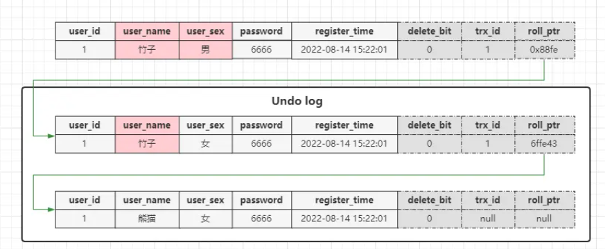 MySQL提供的锁机制确实能解决并发事务带来的一系列问题,但由于加锁后会让一部分事务串行化,而MySQL本身就是基于磁盘实现的,性能无法跟内存型数据库娉美,因此并发事务串行化会使其效率更低。因此MySQL官方在设计时,抓破脑袋的想:有没有办法再快一点!!最终,MVCC机制就诞生了,相较于加锁串行化执行,MVCC机制的出现,则以另一种形式解决了并发事务造成的问题。 ### 并发事务的四种场景 ##### 读-读场景 读-读场景即是指多个事务/线程在一起读取一个相同的数据,比如事务T1正在读取ID=88的行记录,事务T2也在读取这条记录,两个事务之间是并发执行的。 MySQL执行查询语句,绝对不会对引起数据的任何变化,因此对于这种情况而言,不需要做任何操作,因为不改变数据就不会引起任何并发问题。 ##### 写-写场景 写-写场景也比较简单,也就是指多个事务之间一起对同一数据进行写操作,比如事务T1对ID=88的行记录做修改操作,事务T2则对这条数据做删除操作,事务T1提交事务后想查询看一下,哦豁,结果连这条数据都不见了,这也是所谓的脏写问题,也被称为更新覆盖问题,对于这个问题在所有数据库、所有隔离级别中都是零容忍的存在,最低的隔离级别也要解决这个问题。 ##### 读-写、写-读场景 读-写、写-读实际上从宏观角度来看,可以理解成同一种类型的操作,但从微观角度而言则是两种不同的情况,读-写是指一个事务先开始读,然后另一个事务则过来执行写操作,写-读则相反,主要是读、写发生的前后顺序的区别。 并发事务中同时存在读、写两类操作时,这是最容易出问题的场景,脏读、不可重复读、幻读都出自于这种场景中,当有一个事务在做写操作时,读的事务中就有可能出现这一系列问题,因此数据库才会引入各种机制解决。 ##### 各场景下解决问题的方案 对于写-写、读-写、写-读这三类场景,MySQL都是利用加锁的方案确保线程安全,但上面说到过,加锁会导致部分事务串行化,因此效率会下降,而MVCC机制的诞生则解决了这个问题。 先来设想一个问题:加锁的目的是什么?防止脏写、脏读、不可重复读及幻读这类问题出现。 对于脏写问题,这是写-写场景下会出现的,写-写场景必须要加锁才能保障安全,因此先将该场景排除在外。再想想:对于读-写并存的场景中,脏读、不可重复读及幻读问题都出自该场景中,但实际项目中,出现这些问题的几率本身就比较小,为了防止一些小概念事件,就将所有操纵同一数据的并发读写事务串行化。 因此MySQL就基于读-写并存的场景,推出了MVCC机制,在线程安全问题和加锁串行化之间做了一定取舍,让两者之间达到了很好的平衡,即防止了脏读、不可重复读及幻读问题的出现,又无需对并发读-写事务加锁处理。 ### MVCC技术具体体现 假设我发布了一篇关于《MySQL事务机制》的文章,发布后挺受欢迎的,因此有不少小伙伴在看,其中有一位小伙伴比较细心,文中存在两三个错别字,被这位小伙伴指出来了,因此我去修正错别字后重新发布。 问题来了,对于文章首次发布也好,重新发布也罢,绝对要等审核通过后才会正式发布的,那我修正文章后重新发布,文章又会进入「审核中」这个状态,此时对于其他正在看、准备看的小伙伴来说,文章是不是就不见了?毕竟文章还在审核撒,因此对这个业务需求又该如何实现呢?多版本! 啥意思呢?也就是说,对于首次发布后通过审核的文章,在后续重新发布审核时,用户可以看到更新前的文章,也就是看到老版本的文章,当更新后的文章审核通过后,再使用新版本的文章代替老版本的文章即可。 这样就能做到新老版本的兼容,也能够确保文章修正时,其他正在阅读的小伙伴不会受影响,而MySQL-MVCC机制的思想也大致相同。 ### MySQL-MVCC多版本并发控制 MySQL中的多版本并发控制,也和上面给出的例子类似,毕竟回想一下,脏读、不可重复读、幻读问题都是由于多个事务并发读写导致的,但这些问题都是基于最新版本的数据并发操作才会出现,那如果读、写的事务操作的不是同一个版本呢?比如写操作走新版本,读操作走老版本,这样是不是无论执行写操作的事务干了啥,都不会影响读的事务?答案是Yes。 不过要稍微记住,MySQL中仅在RC读已提交级别、RR可重复读级别才会使用MVCC机制。 因为如果是RU读未提交级别,既然都允许存在脏读问题、允许一个事务读取另一个事务未提交的数据,那自然可以直接读最新版本的数据,因此无需MVCC介入。 同时如若是Serializable串行化级别,因为会将所有的并发事务串行化处理,也就是不论事务是读操作,亦或是写操作,都会被排好队一个个执行,这都不存在所谓的多线程并发问题了,自然也无需MVCC介入。 因此要牢记:MVCC机制在MySQL中,仅有InnoDB引擎支持,而在该引擎中,MVCC机制只对RC、RR两个隔离级别下的事务生效。 ### MVCC机制实现原理剖析 >MVCC机制主要通过隐藏字段、Undo-log日志、ReadView这三个东西实现的,因而这三玩意儿也被称为“MVCC三剑客”! ##### InnoDB表的隐藏字段 通常而言,当你基于InnoDB引擎建立一张表后,MySQL除开会构建你显式声明的字段外,通常还会构建一些InnoDB引擎的隐藏字段,在InnoDB引擎中主要有`DB_ROW_ID`、`DB_Deleted_Bit`、`DB_TRX_ID`、`DB_ROLL_PTR`这四个隐藏字段,挨个简单介绍一下。 - **隐藏主键 - ROW_ID(6Bytes)** 对于InnoDB引擎的表而言,由于其表数据是按照聚簇索引的格式存储,因此通常都会选择