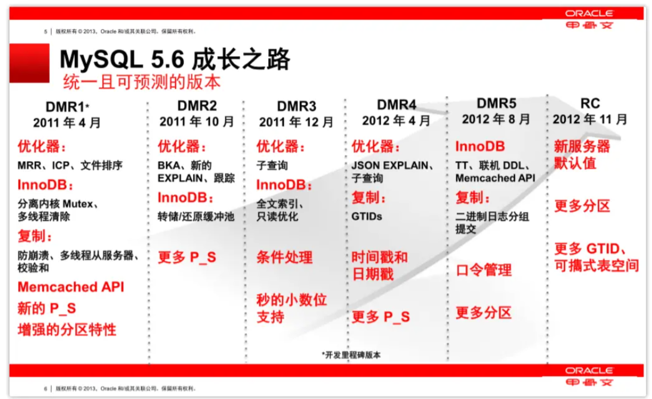 MySQL5.6是Oracle的得意之作,该版本是让MySQL真正走向高性能数据库的里程碑版本,在此之前的MySQL版本中,虽然功能也较为丰富,但性能相较于同期的Oracle数据库而言,其实表现并不佳。直到Oracle公司接手MySQL后,首先就对其进行了大刀阔斧的改进,从Oracle中移植了很多特性过来,同时废弃一些原有的鸡肋功能,也优化了很多内部实现,最终打造出了MySQL5.6这个版本。 ## 1.支持只读事务(Read-Only) 在此之前的版本中,MySQL默认会为每个事务都分配事务ID,所有事务都一视同仁,但在5.6版本中开始支持只读事务,MySQL内部会有两个事务链表,一个是只读事务链表,一个是正常事务链表。 这样做的好处在于:其他事务利用MVCC机制读取数据时,生成的ReadView读视图中的活跃事务链表会小很多很多,因此遍历的速度更快,同时也无需为其分配回滚段,从而进一步提升了MySQL整体的查询性能。 ## 2. InnoDB存储引擎增强 >主要就说一下InnoDB的核心:BufferPool缓冲池相关的改进项,主要有两点:刷盘策略改进、缓冲池预热。 ##### 缓冲池刷盘策略优化 在之前的版本的InnoDB-BufferPool缓冲池中,变更过的数据页会共用MySQL后台的刷盘线程,也就是redo-log、undo-log、bin-log.....一系列内存到磁盘的刷盘工作,都是采用同一批线程来完成。在MySQL5.6版本中,BufferPool引入了独立的刷盘线程,也就意味着缓冲池中变更过的数据页会由专门的线程来负责刷盘,这样能够提升缓冲池的刷盘效率,无需排队等待刷写。 同时BufferPool的刷盘线程,还支持开启多线程并发刷盘操作,这样在缓冲池较大的情况下,能够进一步提升刷盘的效率,从而让数据落盘的效率更快,从一定程度上也提升了数据的安全性,毕竟内存中的数据随时都有几率丢失,但落盘后基本上不是硬件损坏,都有可能恢复过来。 ##### BufferPool缓冲池预热 缓冲池预热是一种特别好的机制,在之前版本的内存缓冲池中,当MySQL关闭时,原本内存中的热点数据都会被清空,重启后所有的热点数据又需要经过时间的沉淀,然后才能留在内存中。但MySQL5.6版本中,每次关闭MySQL时都会将内存中的热点数据页保存到磁盘中,当重启时会直接从磁盘中载入之前的热点数据,避免了热点数据的重新“选拔”! 而预热的含义是:出现意外变故时,先将上次选拔赛中最优秀的那批人,把对应的名字保存在一个名单中,处理完变故后,只需要找到这个名单,把名单上的人喊过来继续选拔即可,这样做显然将效率提升了N倍。 ## 3. 新增Performance_Schema库监控全局资源 如果对MySQL比较熟悉的小伙伴应该清楚,在之前的版本中存在一个名为information_schema的库,其中会记录一些MySQL运行期间需要用到的表,比如视图管理、存储过程与函数的管理、临时表的管理、会话的管理、触发器的管理、表分区的管理......,这些内容的信息都会被存储到information_schema库中。 而在MySQL5.6中,官方又加入了一个新的自带库:performance_schema,这里面会记录:数据库整体的监控信息,比如事务监控信息、最近执行的SQL信息、最近连接的客户端信息、数据库各空间的使用信息......,基于这个库可以在线上构建出一个完善的MySQL监控系统: - Statements/execution stages:MySQL统计的一些消耗资源较高的SQL语句。 - Table and Index I/O:MySQL统计的那些表和索引会导致I/O负载过高。 - Table Locks:MySQL统计的表中数据的锁资源竞争信息。 - Users/Hosts/Accounts:消耗资源最多的客户端、IP机器、用户。 - Network I/O ## 4. 索引下推机制(Index Condition Pushdown) Index Condition Pushdown索引下推简称ICP,它是MySQL5.6版本以后引入的一种优化机制。 索引下推在MySQL5.6版本之后是默认开启的,可以通过命令set optimizer_switch='index_condition_pushdown=off|on';命令来手动管理。 ## 5. MRR(Multi-Range Read)机制 Multi-Range Read简称为MRR机制,这也是和索引下推一同在MySQL5.6版本中引入的性能优化措施,那什么叫做MRR优化呢? MRR机制主要针对于辅助索引的回表查询,减少离散IO,并且将随机IO转换为顺序IO,从而提高查询效率。 ```sql SET @@optimizer_switch='mrr=on|off,mrr_cost_based=on|off'; ``` 可以通过上述这条命令开启或关闭MRR机制,MySQL5.6及以后的版本是默认开启的。 ## 6. 主从数据同步的复制改进 在MySQL5.6中,针对于主从数据同步的问题,主要引入了GTID复制、无损复制(增强半同步复制)、延时复制、并行复制这四种技术。 ## 7.MySQL5.6中的其他特性 - 索引增强:全文索引支持InnoDB与亚洲语种分词、支持空间索引等。 - 表分区增强:单表分区数量最大可创建8192个、分区锁性能提升、支持cloumns分区类型。 - 增强日期类型:time、datetime、timestamp精度提升到微秒级,datetime容量缩减到5字节。 - 日志增强:Redo-log文件大小限制由4G→512G、Undo-log文件可独立指定位置存储。 - 支持在线DDL(Online DDL)、对limit语句做了优化......  除开上述外,还有很多很多与之前不同的变更,官方号称在5.6中修复了1667个Bug,因此想要更为全面的了解,可阅读[《MySQL官网-5.6版手册》](https://dev.mysql.com/doc/refman/5.6/en/ "《MySQL官网-5.6版手册》")。