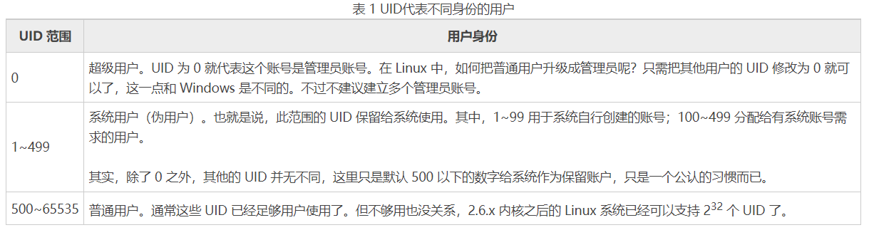 #### Linux用户和组的关系 - 一对一:一个用户可以存在一个组中,是组中的唯一成员; - 一对多:一个用户可以存在多个用户组中,此用户具有这多个组的共同权限; - 多对一:多个用户可以存在一个组中,这些用户具有和组相同的权限; - 多对多:多个用户可以存在多个组中,也就是以上 3 种关系的扩展。 #### UID和GID(用户ID和组ID) - 登陆 Linux 系统时,虽然输入的是自己的用户名和密码,但其实 Linux 并不认识你的用户名称,它只认识用户名对应的 ID 号(也就是一串数字)。Linux 系统将所有用户的名称与 ID 的对应关系都存储在 /etc/passwd 文件中。说白了,用户名并无实际作用,仅是为了方便用户的记忆而已。 - 每个文件都有自己的拥有者 ID 和群组 ID,当显示文件属性时,系统会根据 /etc/passwd 和 /etc/group 文件中的内容,分别找到 UID 和 GID 对应的用户名和群组名,然后显示出来。 #### /etc/passwd内容解释 - /etc/passwd 文件,是系统用户配置文件,存储了系统中所有用户的基本信息,并且所有用户都可以对此文件执行读操作。 - Linux 系统中默认用户很多,这些用户中的绝大多数是系统或服务正常运行所必需的用户,这种用户通常称为系统用户或伪用户。系统用户无法用来登录系统,但也不能删除,因为一旦删除,依赖这些用户运行的服务或程序就不能正常执行,会导致系统问题。 - /etc/passwd 文件中每行记录对应一个用户,每行用户信息都以 ":" 作为分隔符,划分为 7 个字段,每个字段所表示的含义如下: ```html 用户名:密码:UID(用户ID):GID(组ID):描述性信息:主目录:默认Shell ``` - 用户名:用户名,就是一串代表用户身份的字符串。 - 密码:"x" 表示此用户设有密码,但不是真正的密码,真正的密码保存在 /etc/shadow 文件中 - UID:UID,也就是用户 ID。每个用户都有唯一的一个 UID,Linux 系统通过 UID 来识别不同的用户。 - GID:全称“Group ID”,简称“组ID”,表示用户初始组的组 ID 号。 - 描述性信息:这个字段并没有什么重要的用途,只是用来解释这个用户的意义而已。 - 主目录:也就是用户登录后有操作权限的访问目录,通常称为用户的主目录。 - 默认的Shell:Shell 就是 Linux 的命令解释器,是用户和 Linux 内核之间沟通的桥梁。  #### /etc/shadow(影子文件) - /etc/shadow 文件,用于存储 Linux 系统中用户的密码信息,又称为“影子文件”。由于该文件允许所有用户读取,易导致用户密码泄露,因此 Linux 系统将用户的密码信息从 /etc/passwd 文件中分离出来,并单独放到了此文件中。 - /etc/shadow 文件只有 root 用户拥有读权限,其他用户没有任何权限,这样就保证了用户密码的安全性。注意,如果这个文件的权限发生了改变,则需要注意是否是恶意攻击。 - 同 /etc/passwd 文件一样,文件中每行代表一个用户,同样使用 ":" 作为分隔符,不同之处在于,每行用户信息被划分为 9 个字段。每个字段的含义如下: ```shell 用户名:加密密码:最后一次修改时间:最小修改时间间隔:密码有效期:密码需要变更前的警告天数:密码过期后的宽限时间:账号失效时间:保留字段 ``` - 用户名:同 /etc/passwd 文件的用户名有相同的含义。 - 加密密码:这里保存的是真正加密的密码。目前 Linux 的密码采用的是 SHA512 散列加密算法。这串密码产生的乱码不能手工修改,如果手工修改,系统将无法识别密码,导致密码失效。很多软件透过这个功能,在密码串前加上 "!"、"*" 或 "x" 使密码暂时失效。 所有伪用户的密码都是 "!!" 或 "*",代表没有密码是不能登录的。当然,新创建的用户如果不设定密码,那么它的密码项也是 "!!",代表这个用户没有密码,不能登录。 - 最后一次修改时间:用天表示,日期从1970 年 1 月 1 日算起,可以使用如下命令进行换算: date -d "1970-01-01 888 days",即可将其换算为我们习惯的系统日期。 - 最小修改时间间隔:规定了从第 3 字段(最后一次修改密码的日期)起,多长时间之内不能修改密码。如果是 0,则密码可以随时修改;如果是 10,则代表密码修改后 10 天之内不能再次修改密码。此字段是为了针对某些人频繁更改账户密码而设计的。 - 密码有效期:经常变更密码是个好习惯,为了强制要求用户变更密码,这个字段可以指定距离第 3 字段(最后一次更改密码)多长时间内需要再次变更密码,否则该账户密码进行过期阶段。 - 密码需要变更前的警告天数:与第 5 字段相比较,当账户密码有效期快到时,系统会发出警告信息给此账户,提醒用户 "再过 n 天你的密码就要过期了,请尽快重新设置你的密码!"。该字段的默认值是 7,也就是说,距离密码有效期的第 7 天开始,每次登录系统都会向该账户发出 "修改密码" 的警告信息。 - 密码过期后的宽限天数:也称为“口令失效日”,简单理解就是,在密码过期后,用户如果还是没有修改密码,则在此字段规定的宽限天数内,用户还是可以登录系统的;如果过了宽限天数,系统将不再让此账户登陆,也不会提示账户过期,是完全禁用。如果是 0,则代表密码过期后立即失效;如果是 -1,则代表密码永远不会失效。 - 账号失效时间:同第 3 个字段一样,使用自 1970 年 1 月 1 日以来的总天数作为账户的失效时间。该字段表示,账号在此字段规定的时间之外,不论你的密码是否过期,都将无法使用!该字段通常被使用在具有收费服务的系统中。 - 保留:这个字段目前没有使用,等待新功能的加入。 #### /etc/group文件解析 - /ect/group 文件是用户组配置文件,即用户组的