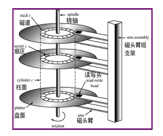 ## 机械硬盘(HDD) - 机械硬盘主要由磁盘盘片、磁头、主轴与传动轴等组成,数据就存放在磁盘盘片中。  #### 机械硬盘的逻辑结构 - 机械硬盘主要由磁盘、磁道、扇区、磁头、柱面与传动轴等组成。  - 磁盘:磁盘一般有一个或多个盘片。每个盘片可以有两面,即第一个盘片的正面为0面,反面为 1 面;第二个盘片的正面为 2 面…依次类推。 - 磁道:每个盘片都在逻辑上有很多的同心圆,最外面的同心圆就是 0 磁道。我们将每个同心圆称作磁道(注意,磁道只是逻辑结构,在盘面上并没有真正的同心圆)。硬盘的磁道密度非常高,通常一面上就有上千个磁道。但是相邻的磁道之间并不是紧挨着的,这是因为磁化单元相隔太近会相互产生影响。 - 扇区:在磁盘上每个同心圆是磁道,从圆心向外呈放射状地产生分割线(扇骨),将每个磁道等分为若干弧段,每个弧段就是一个扇区。每个扇区的大小是固定的,为 512Byte。扇区也是磁盘的最小存储单位。 - 柱面:如果硬盘是由多个盘片组成的,每个盘面都被划分为数目相等的磁道,那么所有盘片都会从外向内进行磁道编号,最外侧的就是 0 磁道。具有相同编号的磁道会形成一个圆柱,这个圆柱就被称作磁盘的柱面,如图 所示。  - 磁头:是硬盘读取数据的关键部件,它的主要作用就是将存储在硬盘盘片上的磁信息转化为电信号向外传输,而它的工作原理则是利用特殊材料的电阻值会随着磁场变化的原理来读写磁盘上的数据,磁头的好坏在很大程度上决定着硬盘盘片的存储密度。比较常用的是GMR(Giant Magneto Resistive)巨磁阻磁头。 - 硬盘的大小是使用"磁头数 x 柱面数 x 扇区数 x 每个扇区的大小"这样的公式来计算的。其中,磁头数(Heads)表示硬盘共有几个磁头,也可以理解为硬盘有几个盘面,然后乘以 2;柱面数(Cylinders)表示硬盘每面盘片有几条磁道;扇区数(Sectors)表示每条磁道上有几个扇区;每个扇区的大小一般是 512Byte。 #### 硬盘的接口 - IDE 硬盘接口(Integrated Drive Eectronics,并口,即电子集成驱动器)也称作 "ATA硬盘" 或 "PATA硬盘",是早期机械硬盘的主要接口,ATA133 硬盘的理论速度可以达到 133MB/s(此速度为理论平均值),  - SATA 接口(Serial ATA,串口),是速度更高的硬盘标准,具备了更高的传输速度,并具备了更强的纠错能力。目前已经是 SATA 三代,理论传输速度达到 600MB/s(此速度为理论平均值)  - SCSI 接口(Small Computer System Interface,小型计算机系统接口),广泛应用在服务器上,具有应用范围广、多任务、带宽大、CPU 占用率低及热插拔等优点,理论传输速度达到 320MB/s,  - SAS接口:全称Serial Attached SCSI,是新一代的SCSI技术,可兼容SATA硬盘,都是采取序列式技术以获得更高的传输速度,可达到12Gb/s。此外也透过缩小连接线改善系统内部空间等。 - FC接口:全称Fibre Channel(光纤通道接口),拥有此接口的硬盘在使用光纤联接时具有热插拔性、高速带宽(4Gb/s或10Gb/s)、远程连接等特点;内部传输速率也比普通硬盘更高。但其价格高昂,因此FC接口通常只用于高端服务器领域 - 现在,普通机械盘接口多为SATA,固态盘接口多为SAS ## 固态硬盘(SSD)  - 固态硬盘和传统的机械硬盘最大的区别就是不再采用盘片进行数据存储,而采用存储芯片进行数据存储。固态硬盘的存储芯片主要分为两种:一种是采用闪存作为存储介质的;另一种是采用DRAM作为存储介质的。目前使用较多的主要是采用闪存作为存储介质的固态硬盘。 - 固态硬盘因为丟弃了机械硬盘的物理结构,所以相比机械硬盘具有了低能耗、无噪声、抗震动、低散热、体积小和速度快的优势;不过价格相比机械硬盘更高,而且使用寿命有限。