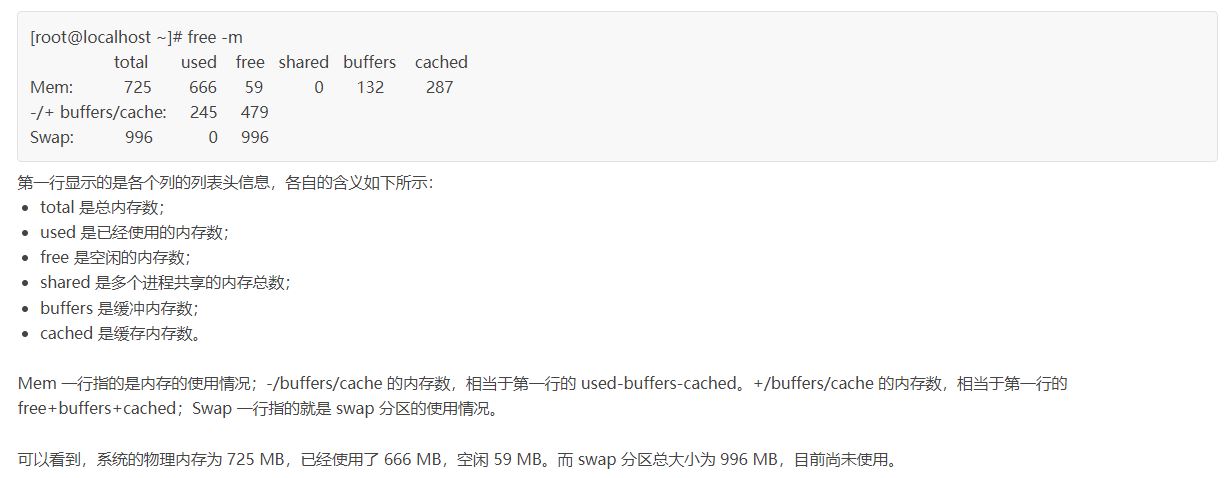 ## df(disk free)命令:检查文件系统的磁盘空间占用情况 - 可以利用该命令来获取硬盘被占用了多少空间,目前还剩下多少空间等信息。 - 语法:df [-ahikHTm] [目录或文件名] - 选项与参数: -a :列出所有的文件系统,包括系统特有的 /proc 等文件系统; -k :以 KBytes 的容量显示各文件系统; -m :以 MBytes 的容量显示各文件系统; -h :以人们较易阅读的 GBytes, MBytes, KBytes 等格式自行显示; -H :以 M=1000K 取代 M=1024K 的进位方式; -T :显示文件系统类型, 连同该 partition 的 filesystem 名称 (例如 ext3) 也列出; -i :不用硬盘容量,而以 inode 的数量来显示 -例子 ```shell 将系统内所有的文件系统列出来! # df 将容量结果以易读的容量格式显示出来 # df -h 将系统内的所有特殊文件格式及名称都列出来 # df -aT 将 /etc 底下的可用的磁盘容量以易读的容量格式显示 # df -h /etc ``` ## du(英文全称:disk used):检查磁盘空间使用量 - du 命令也是查看使用空间的,但是与 df 命令不同的是 du 命令是对文件和目录磁盘使用的空间的查看。 - 语法:du [-ahskm] 文件或目录名称 - 选项与参数: -a :列出所有的文件与目录容量,因为默认仅统计目录底下的文件量而已。 -h :以人们较易读的容量格式 (G/M) 显示; -s :列出总量而已,而不列出每个各别的目录占用容量; -S :不包括子目录下的总计,与 -s 有点差别。 -k :以 KBytes 列出容量显示; -m :以 MBytes 列出容量显示; - 实例 ```shell 只列出当前目录下的所有文件夹容量(包括隐藏文件夹): [root@www ~]# du 将文件的容量也列出来 [root@www ~]# du -a 检查根目录底下每个目录所占用的容量 [root@www ~]# du -sm /* ``` ## fsck(file system check)用来检查和维护不一致的文件系统。 - 若系统掉电或磁盘发生问题,可利用fsck命令对文件系统进行检查。 - 语法:fsck [-t 文件系统] [-ACay] 装置名称 - 选项与参数: -t : 给定档案系统的型式,若在 /etc/fstab 中已有定义或 kernel 本身已支援的则不需加上此参数 -s : 依序一个一个地执行 fsck 的指令来检查 -A : 对/etc/fstab 中所有列出来的 分区(partition)做检查 -C : 显示完整的检查进度 -d : 打印出 e2fsck 的 debug 结果 -p : 同时有 -A 条件时,同时有多个 fsck 的检查一起执行 -R : 同时有 -A 条件时,省略 / 不检查 -V : 详细显示模式 -a : 如果检查有错则自动修复 -r : 如果检查有错则由使用者回答是否修复 -y : 选项指定检测每个文件是自动输入yes,在不确定那些是不正常的时候,可以执行 # fsck -y 全部检查修复。 ## free命令:查看内存使用状态 - 语法:free [选项] - 选项: -b:以 Byte(字节)为单位,显示内存使用情况。 -k:以 KB 为单位,显示内存使用情况,此选项是 free 命令的默认选项。 -m:以 MB 为单位,显示内存使用情况。 -g:以 GB 为单位,显示内存使用情况。 -t:在输出的最终结果中,输出内存和 swap 分区的总量。 -o:不显示系统缓冲区这一列。 -s 间隔秒数:根据指定的间隔时间,持续显示内存使用情况。 - 显示结果的列表头信息 total 是总内存数; used 是已经使用的内存数; free 是空闲的内存数; shared 是多个进程共享的内存总数; buffers 是缓冲内存数; cached 是缓存内存数。