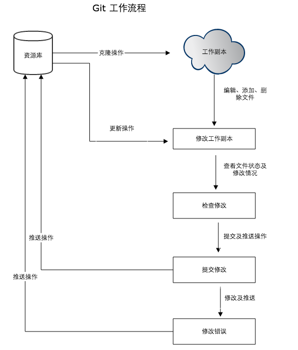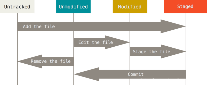 ## Git 工作原理 - **工作区:**就是你在电脑里能看到的目录。 - **暂存区:**英文叫 stage 或 index。一般存放在 .git 目录下的 index 文件(.git/index)中,所以我们把暂存区有时也叫作索引(index)。 - **版本库:**工作区有一个隐藏目录 .git,这个不算工作区,而是 Git 的版本库。 下面这个图展示了工作区、版本库中的暂存区和版本库之间的关系:  - 图中左侧为工作区,右侧为版本库。在版本库中标记为 "index" 的区域是暂存区(stage/index),标记为 "master" 的是 master 分支所代表的目录树。 - 图中我们可以看出此时 "HEAD" 实际是指向 master 分支的一个"游标"。所以图示的命令中出现 HEAD 的地方可以用 master 来替换。 - 图中的 objects 标识的区域为 Git 的对象库,实际位于 ".git/objects" 目录下,里面包含了创建的各种对象及内容。 - 当对工作区修改(或新增)的文件执行 git add 命令时,暂存区的目录树被更新,同时工作区修改(或新增)的文件内容被写入到对象库中的一个新的对象中,而该对象的ID被记录在暂存区的文件索引中。 - 当执行提交操作(git commit)时,暂存区的目录树写到版本库(对象库)中,master 分支会做相应的更新。即 master 指向的目录树就是提交时暂存区的目录树。 - 当执行 git reset HEAD 命令时,暂存区的目录树会被重写,被 master 分支指向的目录树所替换,但是工作区不受影响。 - 当执行 git rm --cached <file> 命令时,会直接从暂存区删除文件,工作区则不做出改变。 - 当执行 git checkout . 或者 git checkout -- <file> 命令时,会用暂存区全部或指定的文件替换工作区的文件。这个操作很危险,会清除工作区中未添加到暂存区中的改动。 - 当执行 git checkout HEAD . 或者 git checkout HEAD <file> 命令时,会用 HEAD 指向的 master 分支中的全部或者部分文件替换暂存区和以及工作区中的文件。这个命令也是极具危险性的,因为不但会清除工作区中未提交的改动,也会清除暂存区中未提交的改动。 ## Git 工作流程 一般工作流程如下: - 克隆 Git 资源作为工作目录。 - 在克隆的资源上添加或修改文件。 - 如果其他人修改了,你可以更新资源。 - 在提交前查看修改。 - 提交修改。 - 在修改完成后,如果发现错误,可以撤回提交并再次修改并提交。 下图展示了 Git 的工作流程:  ## git文件的四种状态  - **Untracked:** 未跟踪, 此文件在文件夹中, 但并没有加入到git库, 不参与版本控制. 通过git add 状态变为Staged. - **Unmodify:** 文件已经入库, 未修改, 即版本库中的文件快照内容与文件夹中完全一致. 这种类型的文件有两种去处, 如果它被修改, 而变为Modified. 如果使用git rm移出版本库, 则成为Untracked文件 - **Modified:** 文件已修改, 仅仅是修改, 并没有进行其他的操作. 这个文件也有两个去处, 通过git add可进入暂存staged状态, 使用git checkout 则丢弃修改过, 返回到unmodify状态, 这个git checkout即从库中取出文件, 覆盖当前修改 - **Staged:** 暂存状态. 执行git commit则将修改同步到库中, 这时库中的文件和本地文件又变为一致, 文件为Unmodify状态. 执行git reset HEAD filename取消暂存, 文件状态为Modified