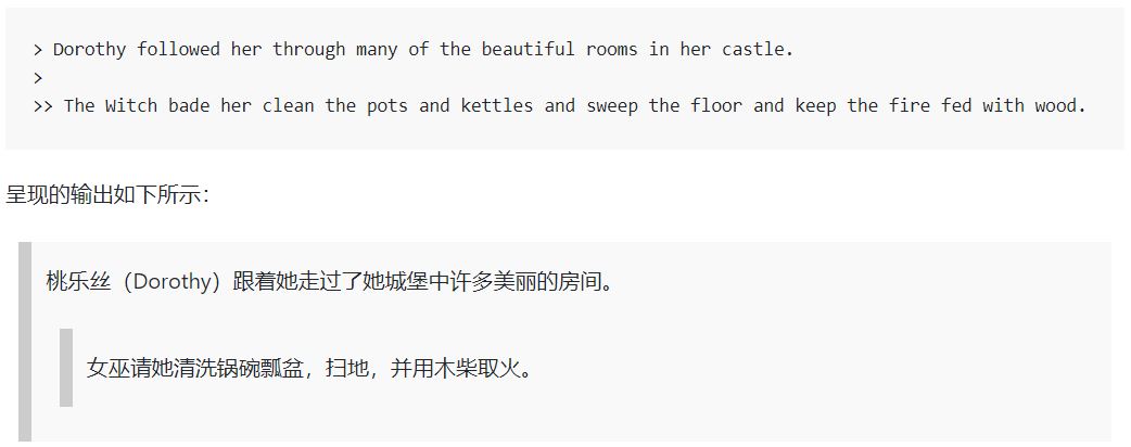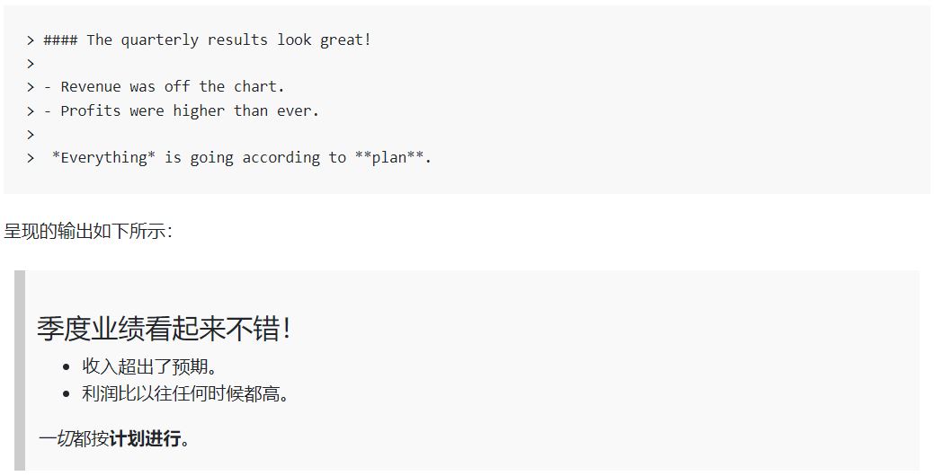 #### 块引用 - 要创建blockquote,请>在段落前面添加一个。  #### 具有多个段落的块引用 - 块引用可以包含多个段落。>在段落之间的空白行上添加一个。  #### 嵌套块引用 - 块引用可以嵌套。>>在要嵌套的段落前面添加一个。  #### 具有其他元素的块引用 - 块引用可以包含其他Markdown格式的元素。并非所有元素都可以使用-您需要进行实验以查看哪些元素有效。