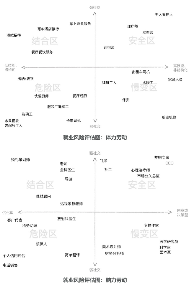 - 强人工智能(AGI):有思维能力的机器,具备自我完善能力。 - 乌托邦人士:将强人工智能的开端和之后的奇点看作人类繁荣的前沿阵地,认为这是人类进一步拓宽智识和永生的机会。 - 反乌托邦人士:真正恐惧的是如果人类本身成为超级智能实现某一目标的障碍,例如改变全球变暖,它们可以轻易甚至是无意中将人类从地球上抹去。埃隆·马斯克将超级智能称为“人类文明面临的最大风险”,他将创造超级智能比为“召唤恶魔”。 ### 人工智能发展现状/168 - 实现强人工智能需要大量的人工智能基础科学的突破,以及深度学习的一连串巨大进步。这些突破与进步需要去除目前弱人工智能的能力天花板,赋予它们更强大的新能力,如多域学习、泛领域学习、自然语言理解、常识推理、规划以及通过少量示例学习。下一步发展情感智能机器人可能需要赋予它们自我意识、幽默感、爱、同情心和审美。这些都是阻碍当前人工智能发展成为强人工智能的关键障碍。每一项新能力的实现都可能需要多项重大突破,真正的强人工智能则意味着解决一切此类障碍。 ### 真正的人工智能危机/171 - 我认为人工智能的四波浪潮席卷了全球经济,它们有潜力撬开更大的贫富差距,引起大范围的技术性失业。未来由技术导致的财富与阶层上的悬殊可能演变为更深刻的裂痕:撕裂社会结构、挑战我们的人格尊严。 - 除了引起直接失业,人工智能还会加剧全球经济不平衡。通过赋予机器人看、听、拿、操作、移动的能力,人工智能会彻底改革制造业,迫使发展中国家那些雇用了大量低薪工人的工厂破产,切断底层人民改善生活的路径,剥夺发展中国家通过低成本出口促进经济发展的机会。 ### 技术乐观主义者和“勒德谬误”/173 - 技术乐观主义者认为,技术可以提升人类的生产力,降低商品及服务的价格。价格降低意味着消费者的消费能力增强,会购买更多商品及服务。这样的结果最终会增加对人力劳动的需求,从而增加就业岗位。 ### 盲目乐观的终结/174 - 规模更大的技术变革会影响到许多行业,从根本上改变经济组织甚至社会结构。这就是经济学家所说的“通用技术”,或称GPTs。:蒸汽机、电力和信息通信技术这三项颠覆性技术的影响延伸到经济的许多角落,改变了我们的生活和工作方式。 ### 人工智能:让技术变得通用/178 - 我相信,人工智能很快会成为举世公认的下一个GPT,刺激经济生产甚至促进社会组织变革。人工智能革命会达到工业革命的规模,甚至规模会更大,速度会更快。 ### 硬件:更好,更快,更强/179 - 业革命历时几代人才完成,而人工智能革命在一代人的时间内就能产生重大影响。这是因为人工智能会在三个催化剂的作用下加速自身的应用与扩散进程: - 第一个催化剂是人工智能算法的易复制性; - 第二个催化剂是风险投资业(VC)的诞生; - 第三个催化剂是中国的影响力。 - 我相信我们可以确定以下几件事: - 第一,在工业时代,新技术带来了长期就业机会增长和工资水平的增长; - 第二,新的GPTs依然很罕见且重要,应单独评估各个GPT对于就业的影响; - 第三,在被广泛认可的三个GPTs中,蒸汽动力和电气化同时推动了生产力和就业率提高,ICT提高了生产力却不一定增加就业; - 第四,人工智能也会是一种GPT,它偏重于技能,应用速度快(受到数字传播、风险投资和中国影响力的加持),这两个特性表明人工智能会对就业和收入分配产生不利影响。 ### 人工智能的“可以”与“不可以”/181 -  - 工作内容主要落在“危险区”的工作(如卡车司机等)在未来几年面临着被取代的高风险。“安全区”的工作(如心理治疗师、理疗师等)在可预见的未来中不太可能被自动化。“结合区”和“慢变区”象限的界限并不太明确:尽管目前不会完全被取代,但工作任务的重组或技术的稳定进步,可能引起针对这些工作岗位的大范围裁员。 ### 经济学家的研究结果/184 - 麦肯锡团队同样使用“工作任务分析法”得出的结论是,全球大约50%的“工作任务”在技术上已经实现自动化。中国的这个数字是51.2%,美国为45.8%。但是他们不认为人的工作会那么快被人工智能取代,他们预测2030年会有30%的任务和14%的工作被人工智能取代。 ### 这些研究忽略了什么/187 - 人工智能的巨大进步并不局限于计算机视觉领域,比如在语音识别、机器阅读和机器翻译领域,新算法也在不断创造纪录和打破纪录。总体而言,这些技术进步和新兴应用让我倾向于采用“工作任务分析法”得出的预测上限。 ### 两类失业:“一对一取代”和“彻底清除”/188 - 我认为“工作任务分析法”也存在误差,因为它遗漏了另一种完全不同的可能导致职业消失:由人工智能推动的新商业模式引起的全行业变革——我称为“产业分析法”。 ### 中美失业问题对比与莫拉维克悖论/191 - 外界普遍认为中国将受到更大的影响:智能机器人将逐渐代替“世界工厂”里的工人,中国的部分支柱产业需要尽快转型。我的观点刚好相反。虽然中国面临着因自动化而引发的就业市场转型,但是大部分转型将比美国的失业问题来得更慢、更晚。 - 机器学习在以下两方面的突破同样也增强了机器的智能水平:从大量数据中辨识形态的能力以及做决策的能力。但是机器人的精细动作(如抓取和操纵物体的能力)仍然远远落后于人类。 ### 担心算法还是担心机器人?/192 - 人工智能自动