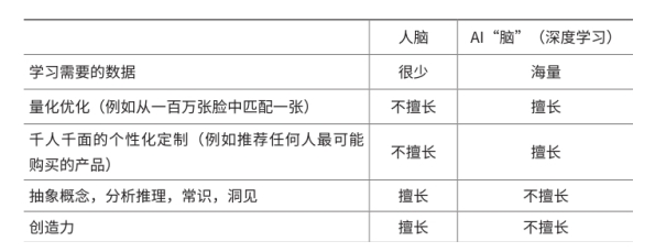 ### 什么是深度学习 - 受人类大脑内部复杂的神经元网络的启发,深度学习模拟生物神经网络,构建出包括输入层和输出层在内的人工神经网络,当将数据输入该网络的输入层后,在输出层就会显现出相应的处理结果。在输入层和输出层之间,可能存在很多中间层(又称隐藏层),从而能够更深入地刻画所处理对象的特征,并具备更强大的函数模拟能力。 ### 深度学习:能力惊人但也力有不逮 - 深度学习所需要的数据量远比人脑所需要的多得多。可是一旦经过大数据训练,它在相同领域的表现将远远超过人类。人类在同一时间内只能把注意力放在少数几件事情上面,而深度学习算法却可以同时处理海量信息,并且发现在大量数据背后的模糊特征之间的关联,这些模糊特征不仅复杂而且微妙,人类往往无法理解,甚至可能不会注意到。 - 在借助大量数据进行训练时,深度学习可以针对每一个用户提供定制化的服务——基于海量数据中较相似用户的数据,对每个用户做出贴切的预测,以达到千人千面的效果。 - 虽然深度学习拥有人类所缺乏的并行处理海量数据的“绝技”,但不具备人类在面对决策时独一无二的汲取过去的经验、使用抽象概念和常识的能力。深度学习想要充分发挥作用,离不开海量的相关数据、单一领域的应用场景以及明确的目标函数,这三项缺一不可。  ### 深度学习带来的问题 - 第一个问题是,深度学习会使AI比你更了解你自己。虽然好处显而易见,但事情的另一面是,AI也会掌握你的缺点。第二个问题,AI有可能过度热衷于企业的目标绩效,而不考虑用户的福祉。 - 奈飞平台2020年的高分纪录片《智能陷阱》提出了一种观点:如果人们对AI的个性化推荐上瘾,这类应用程序就可能缩窄人们的视野、扭曲事实的真相、加剧社会的分化,对人类的情绪、心理健康、幸福感等方面造成负面影响。