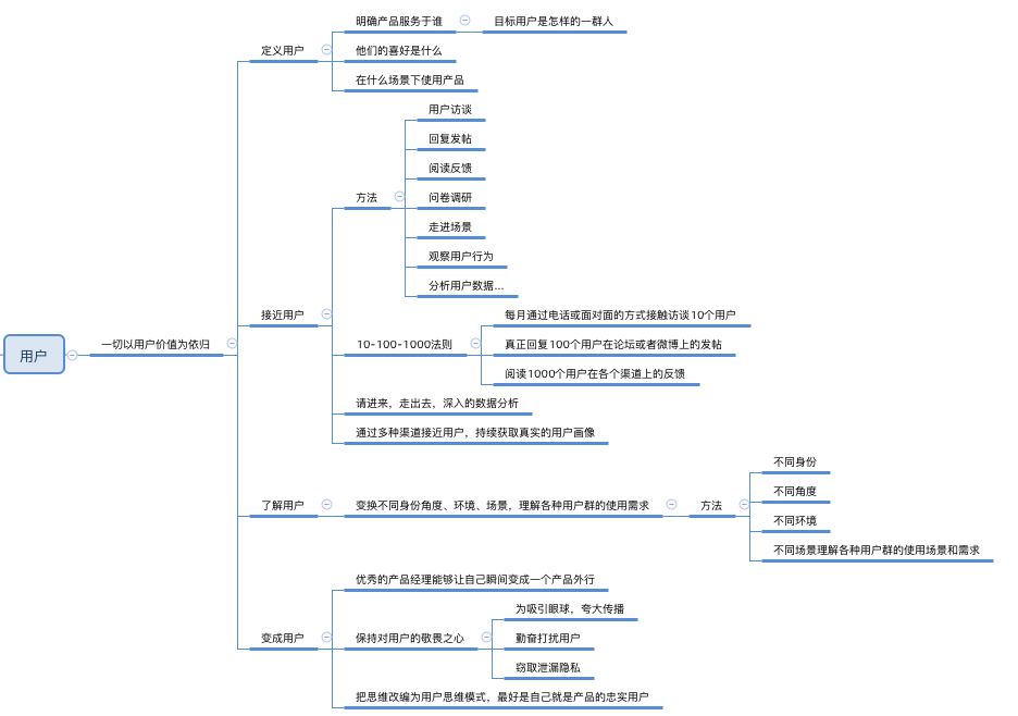 ### 一、定义用户 产品初创,需要考虑你的产品服务于谁,目标用户是怎样一群人,他们的喜好是什么,在什么场景下使用产品。 以QQ音乐为例,产品目标用户非常广泛,为了得到用户画像,产品团队将用户按照年龄段分成80前,80后,85后,90后,95后和00后,分别调查了不同用户群体喜爱的偶像。  ### 二、接近用户 真正理解用户,光靠空想是不行的,需要真刀真枪去接近他们。用户访谈,回复发帖,阅读反馈,问卷调查,走进场景,观察用户行为,分析用户数据….这些都是接近用户的方法。 接近用户,腾讯有一个著名的10-100-1000法则,团队每月通过电话或面对面的方式接触访谈10个用户,真正回复100个用户在论坛或微博上的发帖,阅读1000个用户在各个渠道上的反馈。  腾讯移动互联网事业群启动过一个走近用户,倾听心声的用户零距离项目,大半年项目组陆续走近各个场景,贴近保安,白领,大学生等不同用户群体,观察他们的手机生活,搜集最真实的反馈。 ### 三、了解用户 面对海量用户时,需要变换不同身份,角度,环境,场景,理解各种用户群的使用场景和需求。 腾讯手机管家忽略用户研究,盲目追加功能,使得短时间被竞争对手超越。如何解决这个问题的呢? 手机团队管家做了2件事: 1、产品经理,设计师都到用户中做访谈和调研,定位和挖掘用户需求;2、数据分析,发现用户真实画像。  2、对用户进行了分类: - 蝌蚪:小白用户,什么都不懂,需要一键解决问题; - 穿山甲:在意探索,主动性强,有定制化策略需求; - 考拉:了解情况,但是无所谓; - 河马,尖端型用户,完全懂得手机,不信任安全软件。 通过用户精准画像,提升用户好感度,获得更好的优势。 ### 四、变成用户 把思维改成用户模式,或者自己本身就是产品的忠实用户。洞察人性,以己推人。变成用户的最高境界,即小马哥认为真正好的产品经理,能够瞬间让自己变成一个产品外行,要放下脑袋里的所有事情,想象自己是一个很初级,什么都不懂的用户来使用产品。(空杯心态)。