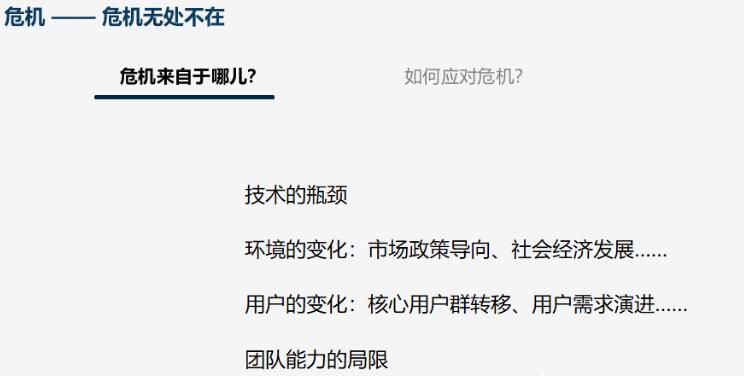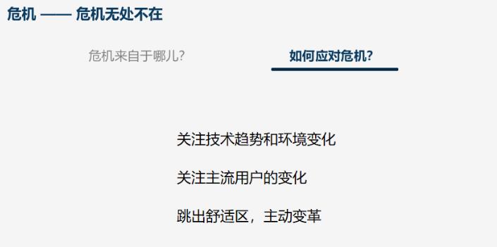 ##### 简单的说分为三点: - 技术与环境不断变化,需要团队持续学习技术、探索应用、保持敏感。 - 用户也在不断变化,需要密切关注,不应该漠视用户的体验。 - 团队不应陷入既得利益中,而是要主动跳出舒适区,主动去变革。