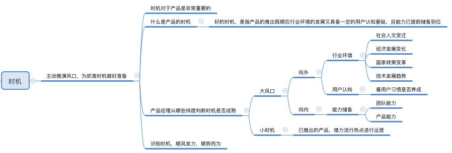 产品经理都知道,时机对于产品是非常重要的。那什么是产品的“时机”?产品经理从哪些维度判断时机是否成熟呢?这一集腾讯8分钟产品课将和大家分享「时机」的重要性。 我们认为,好的时机,是指产品的推出既顺应行业环境的发展,又具备一定的用户认知基础,且能力已提前储备到位。  ### 一、行业环境 包括技术发展趋势,社会人文变迁,经济发展变化,国家政策变革是否孕育新机会。例如直播行业为什么今年会发展的如火如荼,一方面得益于互联网行业发展,智能手机普及,这些技术让直播得以随时随地发生。另一方面,也依赖于消费升级时代的到来,单纯图文、音频这种传统呈现方式的供给已经很多了,用户需要更直观,实时的新方式。直播满足了这样的市场需求,因而形成“打赏”这种成熟的商业模式。 行业环境的分析主要包括以下几点: - 一、 宏观环境分析 - 二、 行业市场分析 - 三、 竞争分析 - 四、 供需分析 - 五、 行业驱动要素分析 - 六、 企业资源和能力分析 ### 二、用户认知 第二个维度是看用户认知,看用户习惯是否养成。 想要知道用户认知是什么东西,我们首先要知道认知的概念。认知的心理学概念是指通过形成概念、知觉、判断或想象等心理活动来获取知识的过程,即个体思维进行信息处理的心理功能。 以微信支付为例,微信初涉及移动支付这个市场时,用户对移动支付已有所接触,非常乐意与接受微信支付这个产品,这有利于微信支付快速打开局面。 如果说前两个维度是向外看,那么第三个维度则是审视自身的能力储备。看团队能力,产品能力,能否在时机到来前就已到位。微信支付面对强大的竞争对手,这项业务能够迅猛发展的关键,也与腾讯多年来在财付通与社交关系链上的能力储备有关。 除了从行业环境,用户认知,能力储备三个维度来判断大的风口、时机,确保产品的推出能顺风发力,顺势而为,对于已推出的产品,产品经理也要善于抓住小时机,借力流行热点,用合适的运营手段,使产品得到更好的发展。 2015年,微信支付与春晚合作的摇一摇红包活动。央视春晚每年都是中国人一道绕不开的“年夜饭”,除了一起吃这道“年夜饭”,还要领红包,所以,摇一摇抢红包是非常符合用户需求和节日气氛的。借助这个热点,微信红包刷新了用户对线上红包的认知,引导用户建立了节气情景下的沟通方式和生活习惯,带动了微信支付业务的发展,助推了微信支付业务弯道超车。  天天P图也是一款非常善于利用热点时机进行推广的产品。配合电视剧《武媚娘》热播,六一儿童节,八一建军节等时间点,先后推出了“全民COS武媚娘”,“一键生成小学生证件照”,“军装照献礼建军90周年”等火爆刷屏活动,每次都实现UV过亿,助力产品荣登APP store等应用市场的榜首。 除了对行业环境,用户认知有敏锐嗅觉与准确判断外,更重要的成功因素,是团队与产品能力的储备。 微信团队成员大多来自QQ邮箱团队,经过3年打磨,QQ邮箱以简洁应用,安全稳定于2008年成为国内使用人数最多的邮箱产品。这支团队有一种面向产品的文化,共同目标是做出一个“专业“,”用户喜爱“的优秀产品,极端重视用户体验,拥有”少即是多“的设计理念。在不断与邮箱用户互动的过程中,团队对于产品和用户的理解不断加深,做出了很多受用户喜爱的产品。 漂流瓶为用户提供了全新的陌生人交友渠道和新奇有趣的体验,大幅提高了邮箱用户活跃度和用户粘性。这一产品形态后来也被应用到微信中。  ### 三、能力储备 除了形成一致的产品理念,QQ邮箱阶段还磨合了团队,搭建了人才梯队,积累了技术能力和敏捷开发的经验。这些都为微信这一阶段奠定了能力基础。 ### 总结 时机:主动推演风口,为抓准时机做好准备 识别时机:1、 行业环境:1)技术发展趋势;2)国家政策变革;3)社会人文变迁;4)经济发展变化; 2、 用户认知:用户习惯养成; 3、 能力储备:1) 产品能力;2)团队能力。 在个人成长方面也有同样的道理,大家看《孟子》里的一段话,孟子引述齐人也就是山东那个地方人的话:“虽有智慧,不如乘势;虽有滋基,不如待时。” 虽然你很聪明,可是要赶上时机成熟的时候,你的智慧发挥出来才到位;虽然你有种田的锄头,可是要等到风和日丽,正好是耕田的季节,你去种田才有效果。 这十六个字告诉我们,努力的时机很重要,在时机没有到来前,我们认真努力是一回事,但是,有这个时机,可能就会让我们努力的效果翻倍。 ##### 课后作业: 你是否有抓住时机或错失时机的例子?当时的思考是什么?你觉得现在周围还有哪些需要抓住的时机吗?