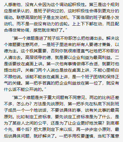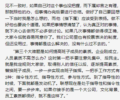 ## 12.1 与时俱进的调整 - 当组织结构发生变化时,管理方法也要做调整。例如,管理者由组长晋升为经理,对团队的管理方法要做调整。 - 基层管理者直接带领着多位员工,与经理带领着三位组长、组长各带着几位员工的管理方法有很大区别。当你的直接下属是管理者的时候,要考虑的是如何给下属管理者搭好台,让他们唱好戏。 ## 12.2 好的团队是合力管理的结果 - 如果团队内部有多位管理者,要计多位管理者的管理行为形成合力。例如,如果是一位经理、多位组长的格局,经理应当多想想如何给组长留出管理的空间,调动他们的积极性,避免管理者之间因为“政令不同”而造成管理力量的互相抵消。 - 经验之谈——联想的建班子 柳传志把管理的重点总结为精练的三个短句:“建班子,定战略,带队伍”,其中“建班子”放在第一位。所谓建班子,就是建立一个好的“领导集体”。具体参考《柳问:柳传志的管理三要素》    ## 12.3 点滴改进,螺旋上升 - 管理的真正挑战在干管理者如何在当前特定的人员。资源和任务的情况下,一步—步带领团队走向成功。这里的成功路径千差万别,要靠管理者审时度势,斟酌再三。只有积极进取的团队管理者才能根据当前的实际情况做出点点滴滴的改进,螺旋上升,逐步实现团队的进步和发展。 - 第一,努力工作。尽自己最大的努力,把工作做好。就好像拉弓,尽自己的力量,弓会越拉越满;如果不用劲,总是没有什么挑战,混事儿可以,进步却很小。 - 第二,多反思。一天下来,自己做了些什么?一周下来,计划完成了多少?工作进展如何?一个里程碑下来,进展顺利吗?如此等等。我们做了哪些,有哪些成绩,有哪些不足,要了然于心。在这个基础上,琢磨多了,就会有改进的新思路。日常的工作都是繁杂的,改进也都是—些小的星星之火。如果坐等划时代的改变,可能等不来,即使等来了,操办人也不是我们自己。 - 第三,获取反馈。通过各种途径听取老板、员工、合作团队的管理者、其他团队员工的反馈,看到成绩,改进不足。 - 第四,多看书。书就好像一面镜子,让我们看到日常看不到的细节和问题。 - 第五,多尝试改进。有了好的想法,记下来,经过认真考虑后,就可以尝试,在实践中逐步完善。 ## 12.4 不要轻易谈团队文化 - 团队文化是一个团队成熟的标志,所以也挺吸引人的。如果你刚刚就任一个团队的领导者,就开始谈团队文化,我要泼—盆冷水。不要轻易谈团队文化。过早地提团队文化,员工会觉得比较虚,起不到应有的凝聚、激励作用。 - 我相信,团队文化有很强的凝聚力,但团队文化是做出来的,不是说出来的。相对更好一些的团队文化形成方式是:在实践中形成,然后管理者把它总结和概括出来。已经做到80%了,管理者再经过提炼和总结,形成几个精练的词或者几句话,方便阐述。当管理者总结出团队文化之后,大部分的员工在内心是认可的,这才是恰当的时机。 - 团队文化有着很强的稳定性。真正的团队文化都是积淀出来的,需要时间。也正是这个原因,管理者不能频繁改变团队文化的提法。团队文化形成之后,就是团队的核心价值观了。 - 在培养团队文化的过程中,我想提醒的—点是,管理者不必去强调员工要“以团队为家”的观念。公司里的团队是商业组织,需要实现商业目的,与家庭是不一样的。 ## 12.5 制度化 - 团队的制度在本质上是—种契约,是管理者和员工都同意的契约,遇到类似的问题直接运用制度来解决就好了,没有必要什么事情都要临时请示管理者。 - 不要轻易制度化。只有经过实践检验、对团队行之有效的经验才有必要形成制度。也不是任何细枝末节都要有制度,制度只是用来规范—些主要的事情。特别是在IT行业,条条框框太多会束缚团队的发展。有的地方也不需要制度化,留出一些可以让员工自己做决定的“空白区”,对于一个团队的健康发展也是必要的。 - 有一点要提醒的是,管理者要注意团队中的“第一次”发生的事情。管理者的处理方法会被员工引用,有点像西方的案例法则。例如,如果你认为要严格考勤,那遇到员工违反规则的情况就要处理,不要等到“下一次”。《领导学》园中指出,在团队里首先发生的行为经常成为团队以后的示例,称为首因效应。 - 如果管理者能够为团队建立—套制度,真是善莫大焉。管理者的“在和不在一个样”可以再做一点扩展,延伸到管理者是否在这个团队工作。如果管理者已经离开,但是当时形成的制度仍然很好地维系了团队运行和发展,是一个大功劳。