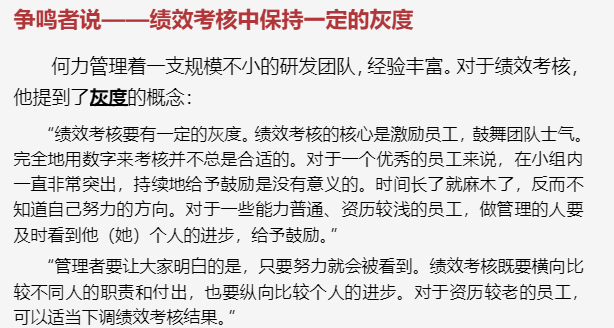 # 7.1 绩效考核是风向标 - 绩效考核的意义是什么?第一,员工通过绩效考核知道自己的工作做得怎么样,领导是怎么评价他(她)的。第二,管理者通过绩效考核明确(之前可能是模糊的)自己对各员工的判断,知道员工和团队现在处在什么位置上。第三,也是最重要的,绩效考核是为了推动和提高员工个人和团队的整体绩效,而不是做些浪费时间的纸面文章。 - 绩效考核要公平公正,当然这也是对所有工作的基本要求。最好的绩效考核是能够提高团队和员工的绩效,而不是做“最后判决”。 - 绩效考核是风向标,考核什么,就会得到什么。例如,对于测试人员的考核,如果你考核bug的数量,你就会得到大量的bug。如果你考核bug的严重程度,你就会得到更多的严重级别高的bug。所以,考核标准和考核流程的设定,管理者都要仔细斟酌。 ## 7.2 客观数据和主观感受的综合 - 管理者基于日常工作的观察,在内心中对员工的绩效就大概有个估计和排名,但也有眼界盲点,日常积累下来的印象只属于主观认识。在绩效考核的时候,一定要有数据作为标准,避免主观臆断。管理者可以把客观数据和主观感受结合起来,尝试得出更公平的考核结里。 - 客观数据和主观感受的综合:绩效考核的70%由各类统计数据决定,30%由管理者的认识决定。 - 在选择和定义要采用的数据时,要尽量选择有代表性和重要性的,减少争议。 - 在日常工作中,管理者可以做一些简单的记录,以免在绩效考核的时候没有办法提供数据。 - 管理者还应提前告知:管理者有权对员工绩效总结报告中的数据提出不同的看法,当管理者需要核对的时候,员工应当主动提供原始数据来证明。复核和检查是管理者的职责,如果他(她)没有做到这一点,就是没有尽到责任。之所以要提前告知,是想避免管理者对数据做核查时对员工产生误会。有的员工可能会想:“还要核对一遍,是不相信我吗?”其实管理者只是在履行职责,并不针对某一位员工。 ## 7.3 全面考核,结果归类 - 如何让员工信服考核结果?正确的事情最有说服力。为了让考核结果准确,考核应当是客观和全面的,例如: - 1.对公司的政策和各项要求的遵循程度。这有点像“政治正确”。在哪个山头唱哪支歌,这是应当做到的。 - 2.技术工作。这是考核的重头戏,绩效考核的数据也主要集中在这一块。 - 3.工作态度和方法,例如工作是否积极,工作是否有条理,是否分清楚了轻重缓急,沟通能力是否强,等等。 - 4.分享和协作。是否能经常与大家分享自己的经验,是否与他人协作良好,是否为团队提供过公共服务,等等。 - 5.同事的反馈 - 6.在敏捷方式下,来自scrum team的反馈也应考虑在内。 - 有的公司可能有考核表,管理者依次对每一项打分,最后统计出总分。我的建议是,在总分的基础上,把具体的分值做一个归类,例如A(优秀)、B(良好)、C(合格)和D(不合格)。再进一步,如果你觉得A、B、C、D四个等级有些粗糙,可以做细化,增加一些细项,例如B+,C- 等。 - 做绩效考核还有一个简单的方法:区分“开拓者”和“追随者”。所谓开拓者,就是在团队内部某一方面带着大家往前冲的,在团队内扮演着重要角色的员工。追随者,在工作上和开拓者配合好,在技术难题被攻克后做好具体的执行工作。先区分开拓者和追随者,然后再细化到更多的等级上,这样可以降低绩效考核的难度。 ## 7.4 横向和纵向的参照 - 考核结果大多并不公布,这是惯例。“张榜公布”考核结果对于团队来说影响非常大,负面效果大于正面效果。除非是公司的统一要求,一个团队不要尝试这方面的举动。既然考核结果不公布,面谈就显得更加重要了。 - 考核结果的面谈是比较难做的,管理者要把握好以下几个方面:1. 准备好数据和事实;2. 营造好一个宽松的氛围;3. 不要做好好先生;4. 把握谈话的走向和基调。 - 在面谈中,管理者要鼓励员工从两个方向上来做参照。第一是横向,让员工明白自己在团队中处于什么位置。员工在了解自己的考核等级评定结果之后,大概会明白自己在团队中的位置。第二是纵向,引导员工与自己的历史比,看看有没有进步。 ## 7.5 绩效考核标准的稳定性和可讨论性 - 考核的标准定了以后,要保持考核标准的稳定性,不能随便改。 - 管理者应当有宽大的胸怀欢迎员工讨论考核标准,并欢迎不同的看法。一方面,如果意见有道理,管理者可以吸纳,这会让考核标准更加科学,被员工所接受。另一方面,考核标准不要随便改变,对每一次修改管理者都要深思熟虑,并且频率不要太高,应缓慢和稳步进行,例如半年或者一年审核和修订一次。修订的时候要和大家解释清楚修订的来龙去脉,让大家知情进而支持新的标准。 ## 7.6 考核后续 —— 关于淘汰最后的10%