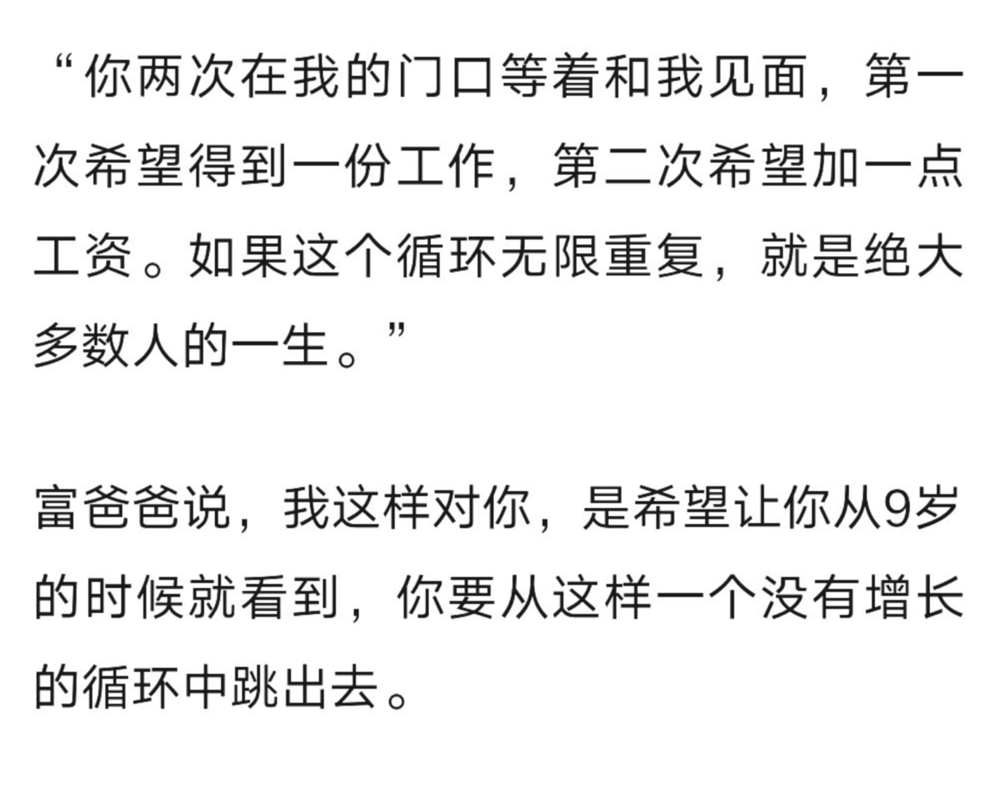 ##### 杠杆和支点 - “用杠杆”是每一个希望改变自己命运的普通人,都应该建立意识,并且不断去体会和练习的能力。 ##### 普通人的循环 - 案例:《穷爸爸富爸爸》  ##### 战略杠杆 - 支点=初心 - 杠杆=自由度 就是在一个你可以自由动作的地方,你可以做和竞争对手不一样的动作。然后你在这个地方,通过你的不同的动作,形成资源的连锁反应。这就是你的杠杆。 - 如何让这个自由度成为自己人生的变量 比如,一个在成熟是想里竞争的企业,看上去,我们的每一个选择,都只能随行就市。但如果我们用第二个模块谈到的穷举方法,你穷举一下企业经营的每一个环节:目标盘市、产品、价格、供应链、渠道及促销,其实每一个环节,企业都拥有自由度。 只是有的企业会把这些运营动作,习惯为某个部门的习惯套路。而有的企业则会有意识地把某个环境做成它的经营杠杆。 - 战略支点与指北针 - 战略支点是企业的使命,是基石性假设,时不变得东西。 - 什么是你的支点? - 就是你强烈地希望什么发生改变。 - 战略指北针 - 衡量每一个动作战略价值的哪粒准星,你瞄准的工具。 - 案例:亚马逊 - 企业使命:成为全球最以客户为中心的公司 - 战略指北针:有利于形成长期领导地位的战略选择 ##### 小结 - 人和人的差距就是这么拉开的。 - 有人更笨没有支点,有人连“吃亏”这个最简单的杠杆都不愿意使用。 - 有人杠杆的支点非常短,问题被解决后,就迅速失去了斗志 - 而有人则没有准星,所有杠杆的组合使用不能形成合力,也因此无法成为时间的朋友。 - 撬动杠杆就是你有意识地使用某种自由度,带来资源的连锁反应。 ##### 思考 ##### 你有什么使用杠杆撬动连锁反应的例子吗?你的支点、杠杆和准星各是什么?